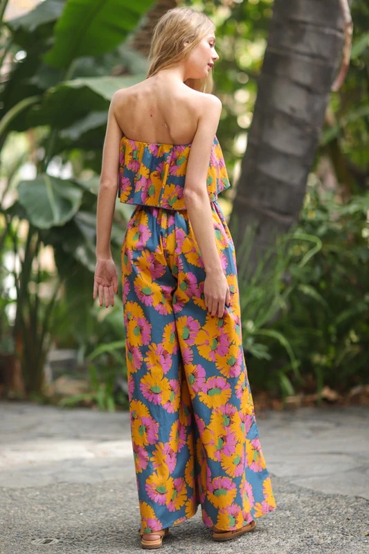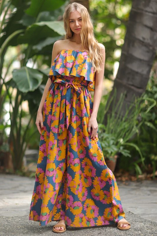 Are you looking for the perfect vacation jumpsuit or weekend party outdoors? You will look and feel amazing in our mustard and teal blue tube ruffle belted jumpsuit