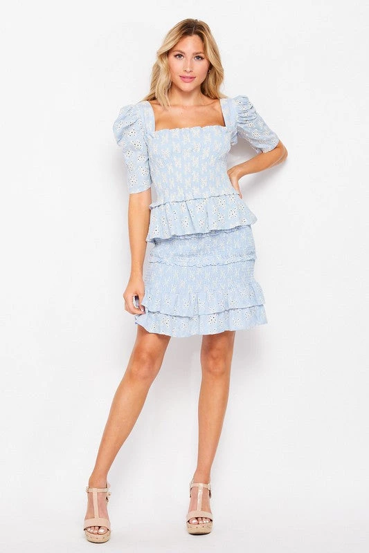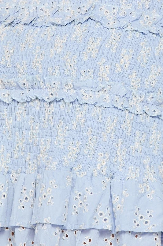 Nothing says summer like powder blue and a cute skirt. You will love our powder blue eyelet smocked mini skirt paired with your favorite nude heels