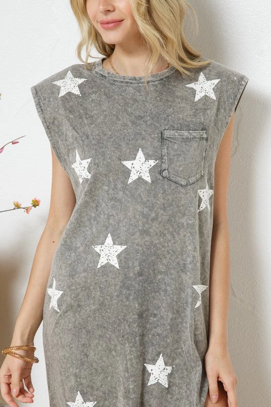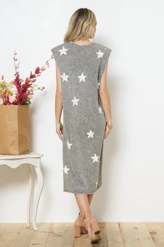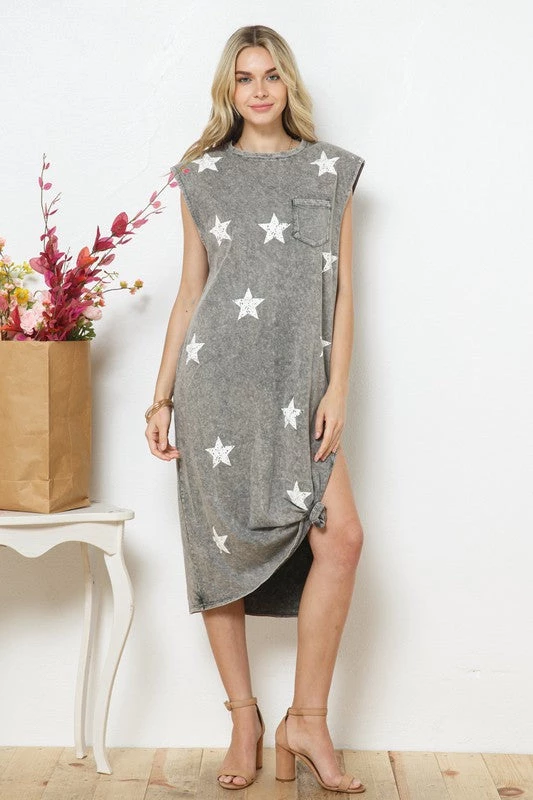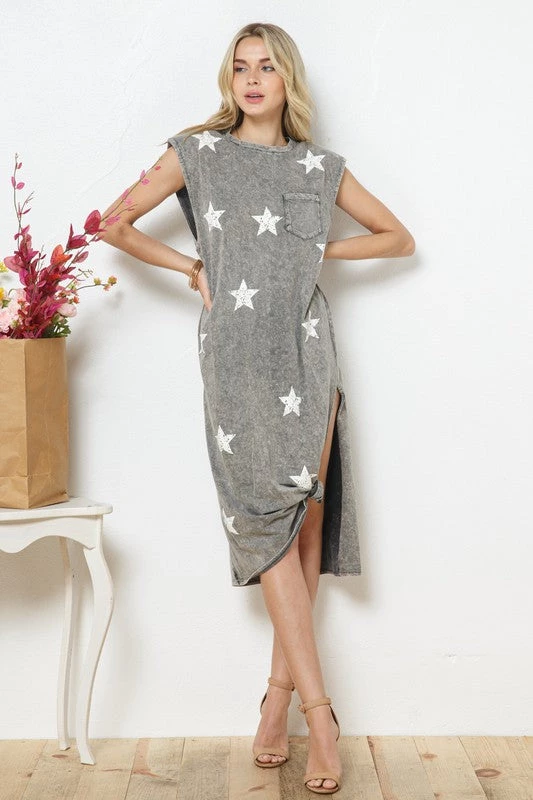 Are you looking for a relaxed and stylish weekend fit? You will love our grey and white star print slit jersey dress paired with your favorite nude heels or white sneakers