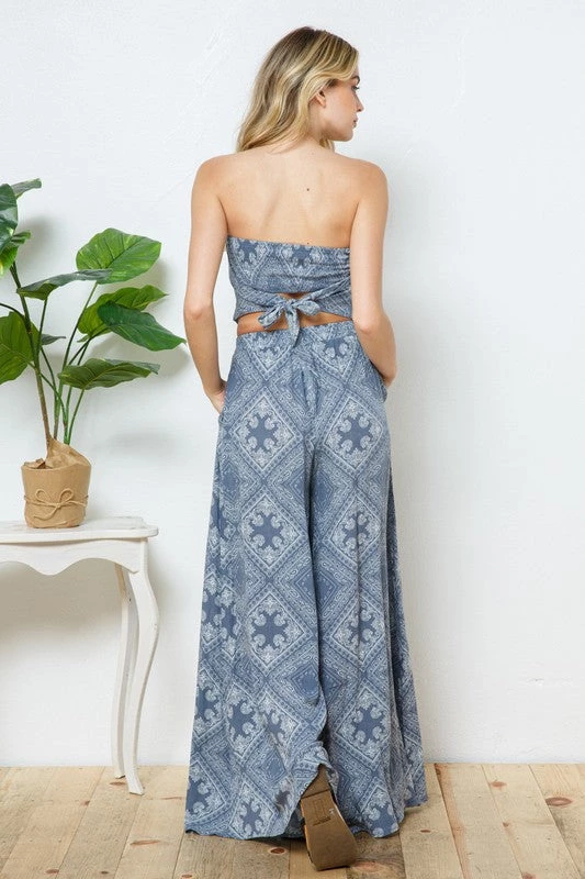 Are you looking for a stunning two-piece set that will turn heads when you enter the room? You will look and feel amazing in our new blue bandeau smocked crop top with palazzo pants set