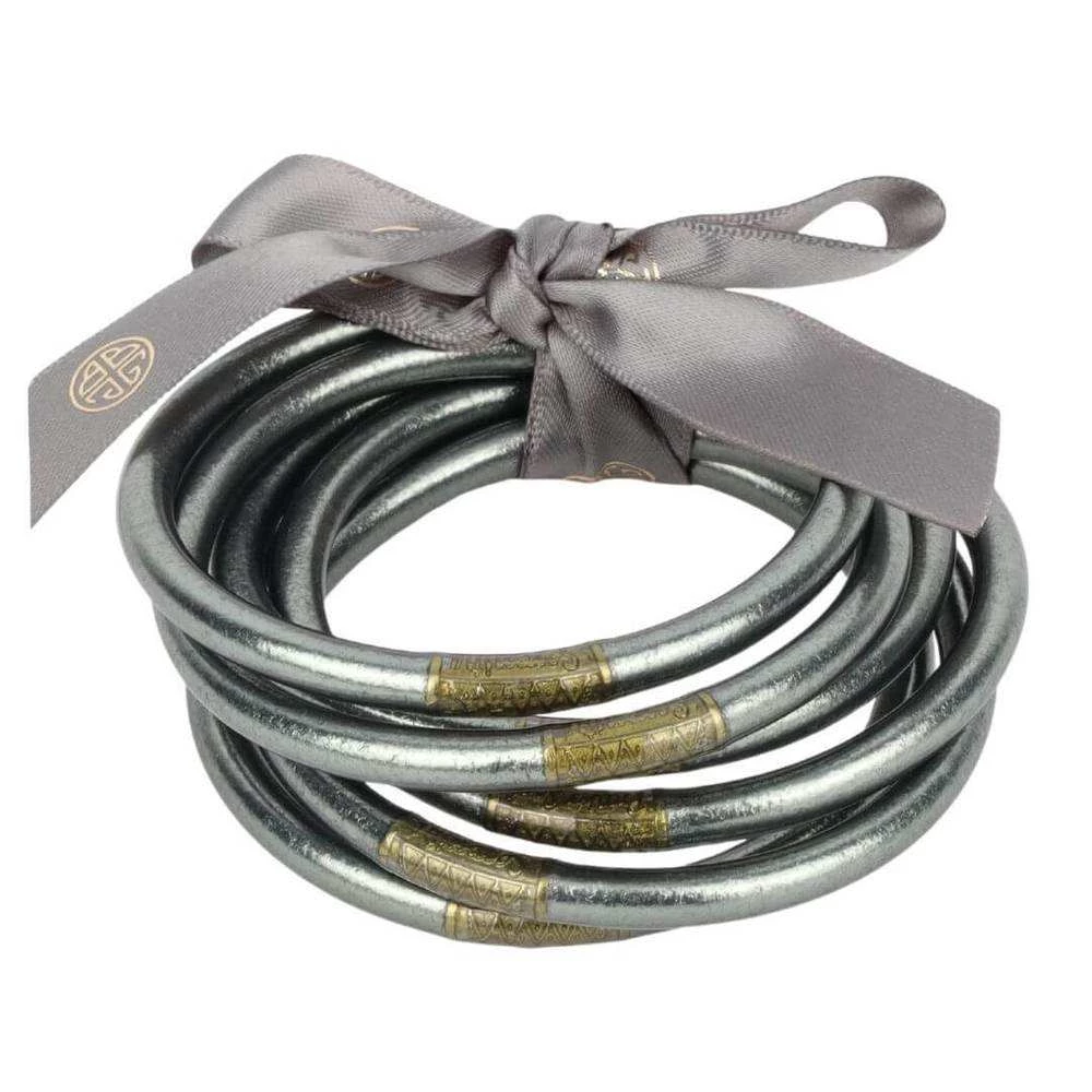 You can wear your Graphite All Weather Bangles® anywhere because they are waterproof and soundless. Our Graphite All Weather Bangle bracelets are made with gold leaf suspended in flexible, polyvinyl carbonate rings, and then sealed with our exclusive BuDhaGirl Serenity Prayer bead, allowing them to go from the pool, to the office, and to the airport (they’re TSA proof) all without needing to leave your wrist.