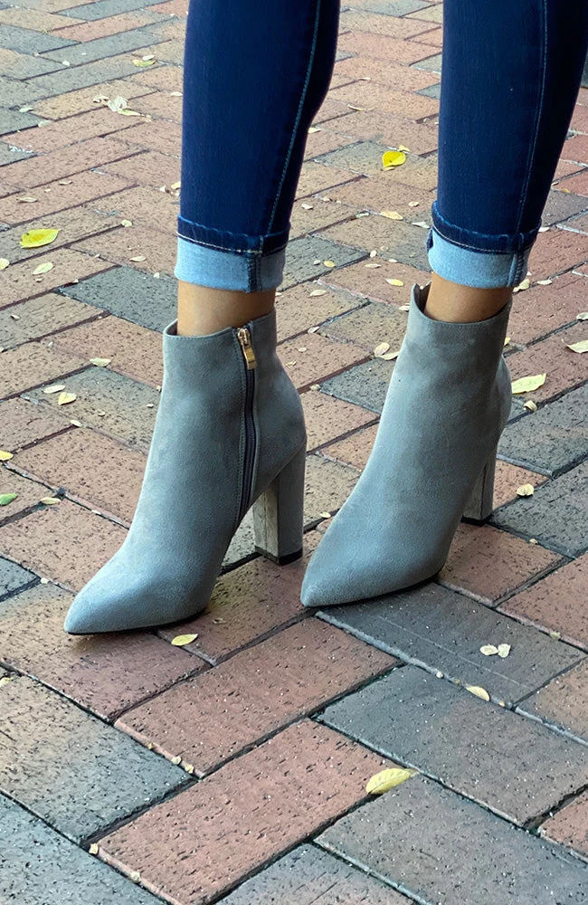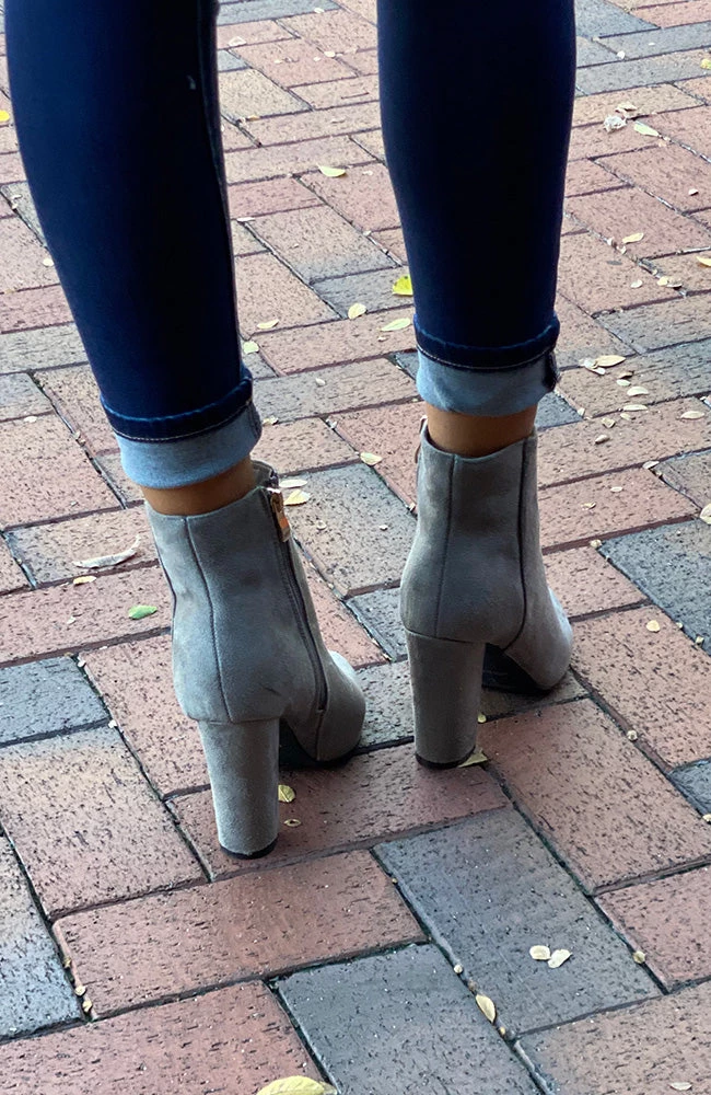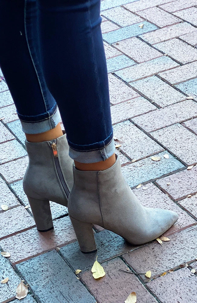 Are you looking for a stylish pair of faux suede boots that look just amazing with denim or your favorite skirt? Check out our super hot Gizelle grey faux suede booties