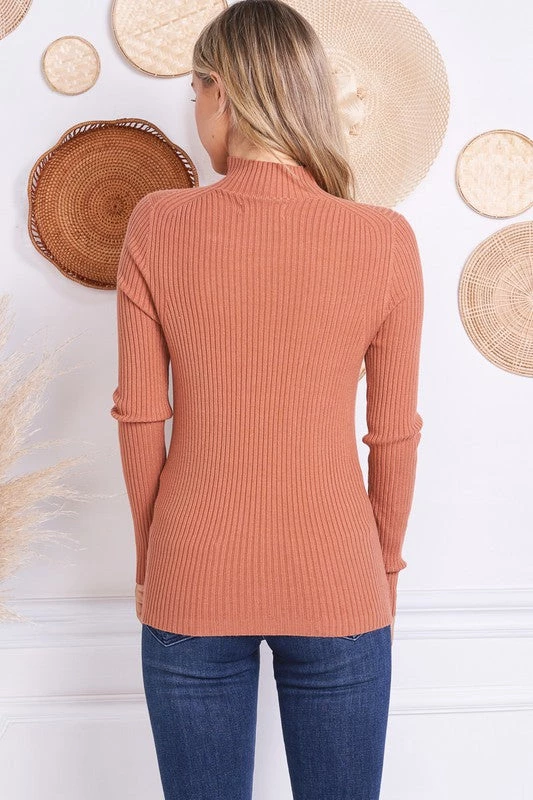 Are you looking for your new favorite fitted top to pair with your favorite denim and boots this fall? Check out our rust-colored cashmere blend fitted ribbed turtleneck