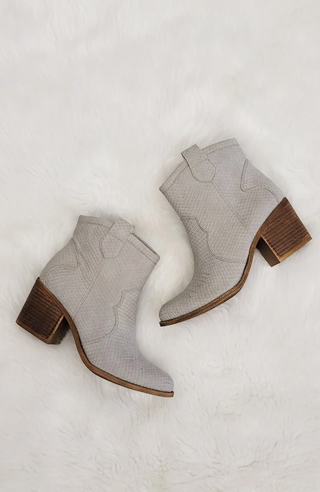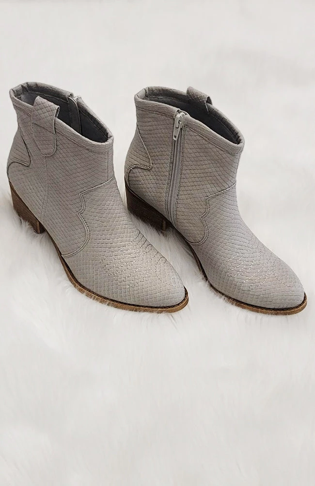 Are you looking for a white bootie that will pretty much look great with all your outfits? Check out our Marie grey snake print booties