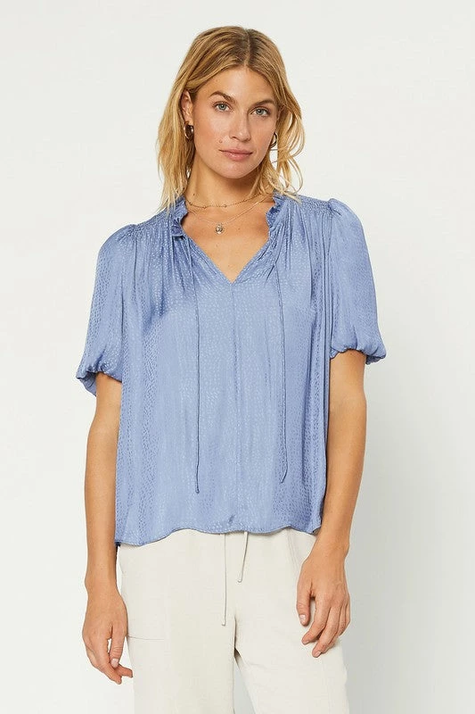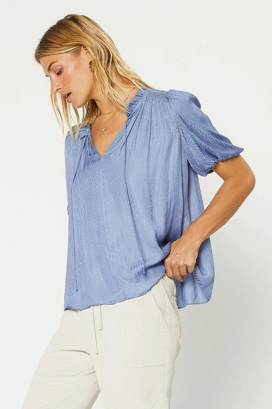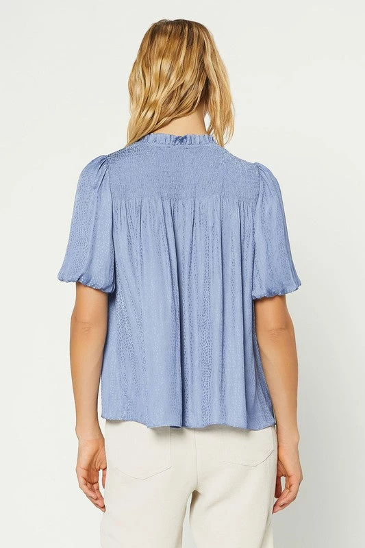 Are you searching for the perfect blue blouse that will look great with white or blue denim? We are in love with our dusty blue ruffled split beck short sleeve blouse