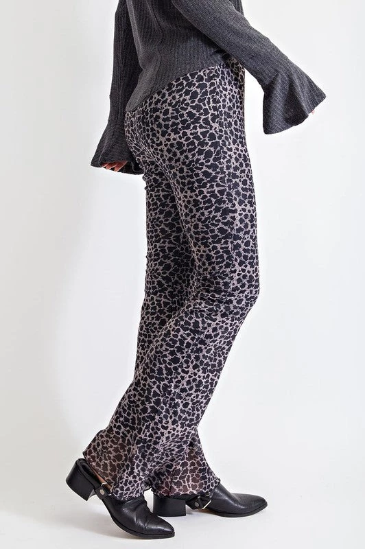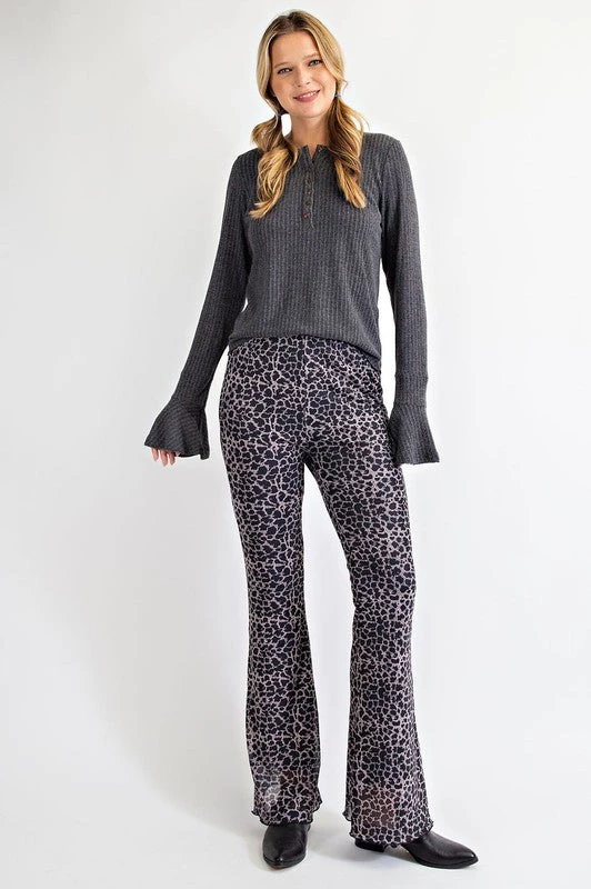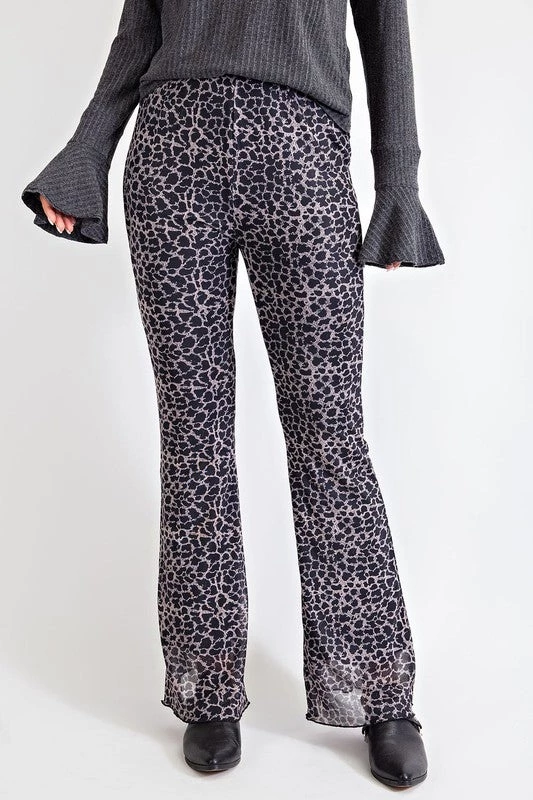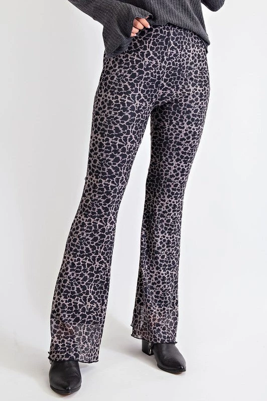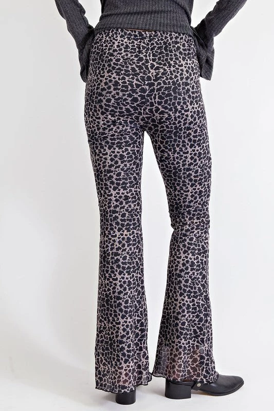 Are you looking for a super cute and unique pair of flared-style pants to spice up your outfits? Check out our black leopard print mesh flared pants