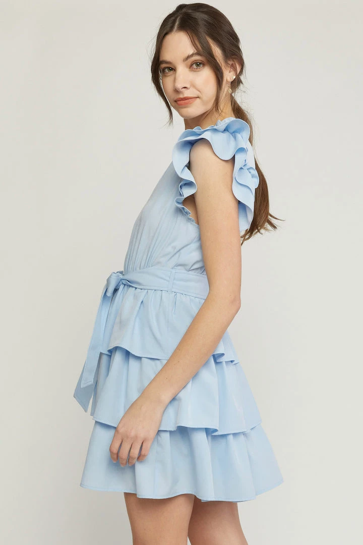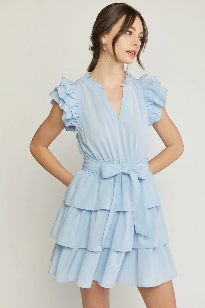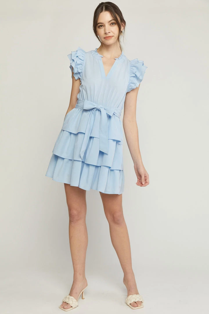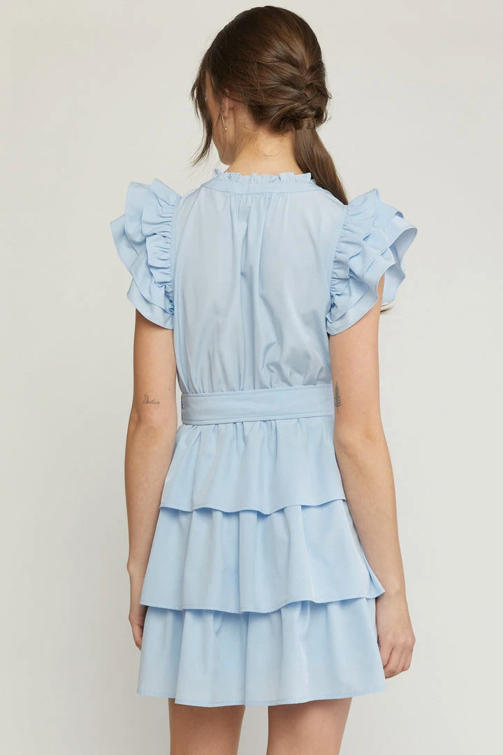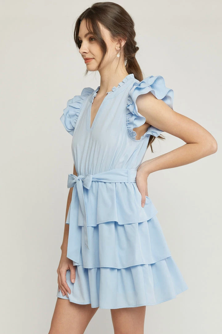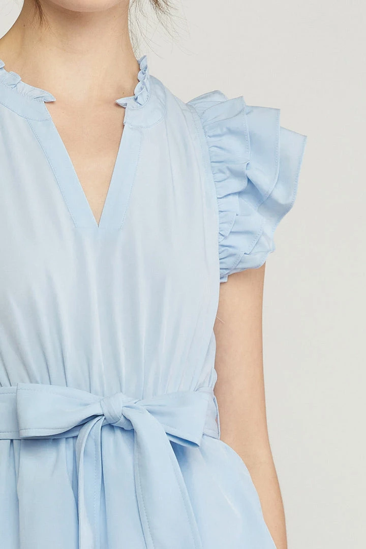 Are you looking for a darling lightweight dress that is perfect for your summer event? You will love our baby blue v neck ruffle sleeve dress paired with your favorite natural colored heels or wedges