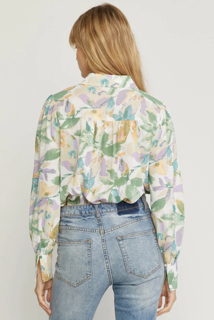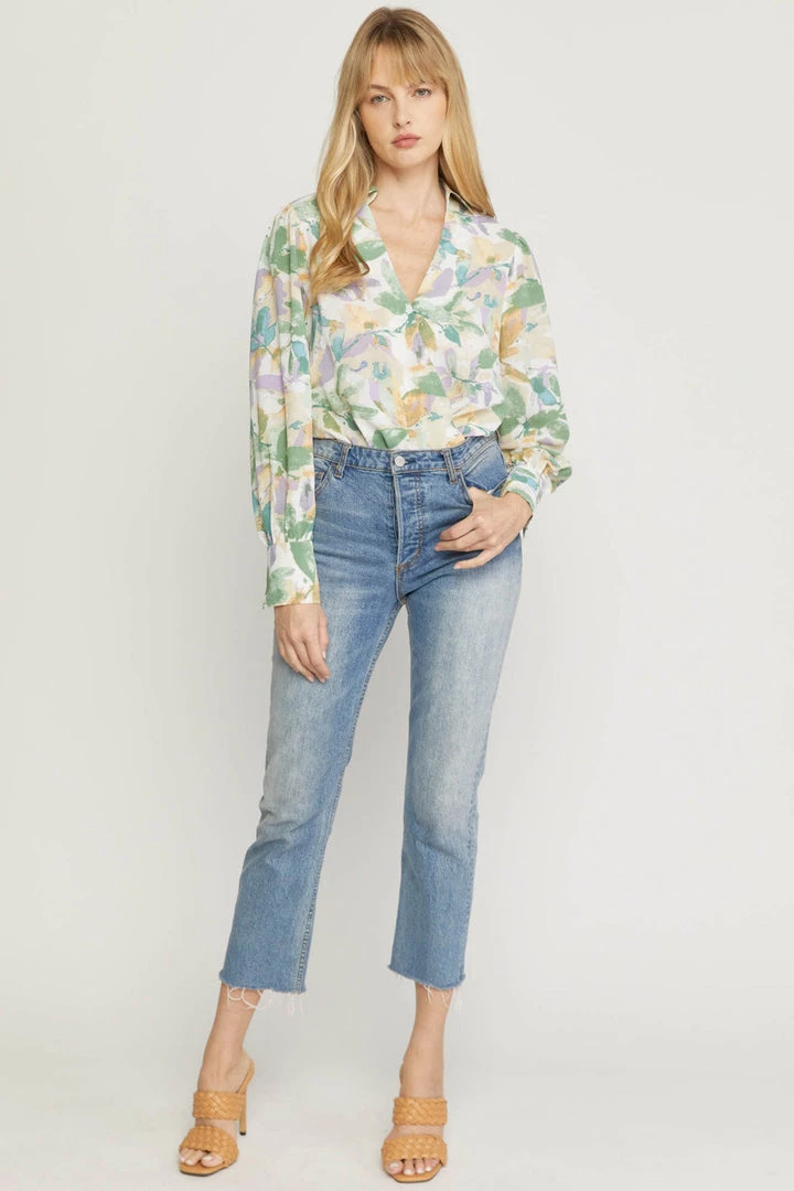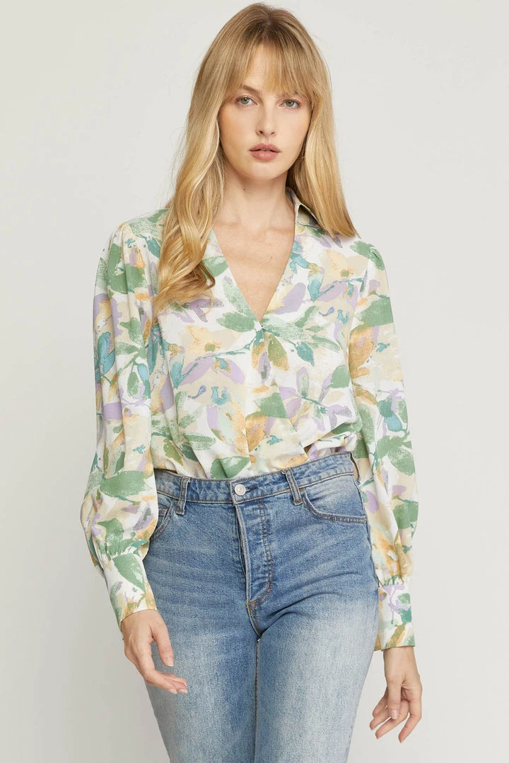 Are you looking for the perfect floral long sleeve top that is a bodysuit as well? Check out our super cute green floral print surplice long sleeve bodysuit