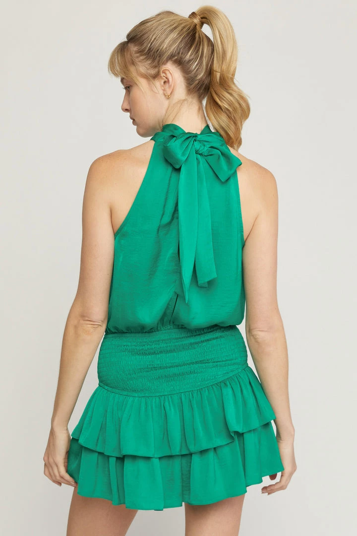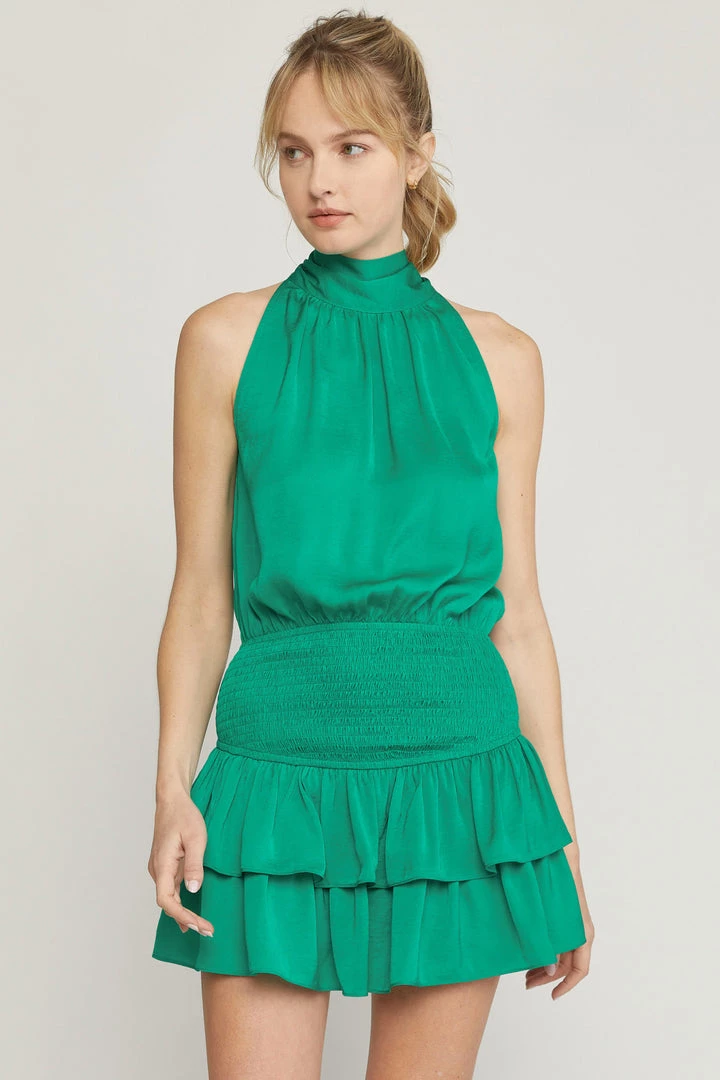 Are you looking for the perfect mini dress for your upcoming evening out? You are going to love our solid green high neck sleeveless mini dress with your favorite heels or wedges
