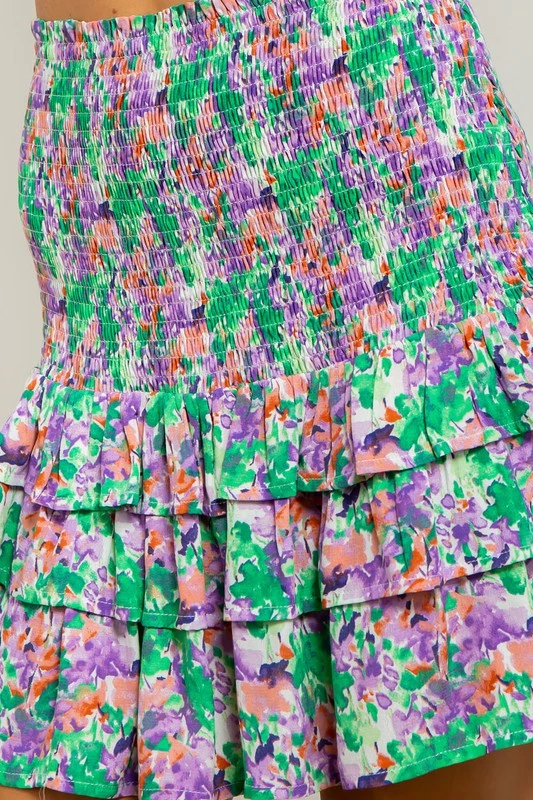 Are you looking for the most darling floral smocked skirt to match your favorite summer tops? You will love our purple and floral multi design smocked mini skirt