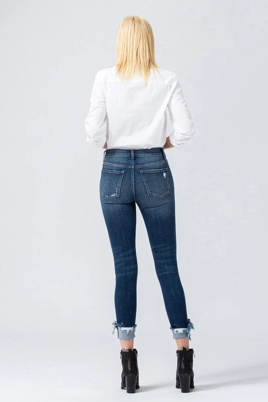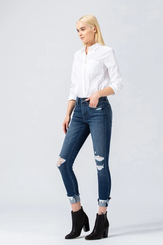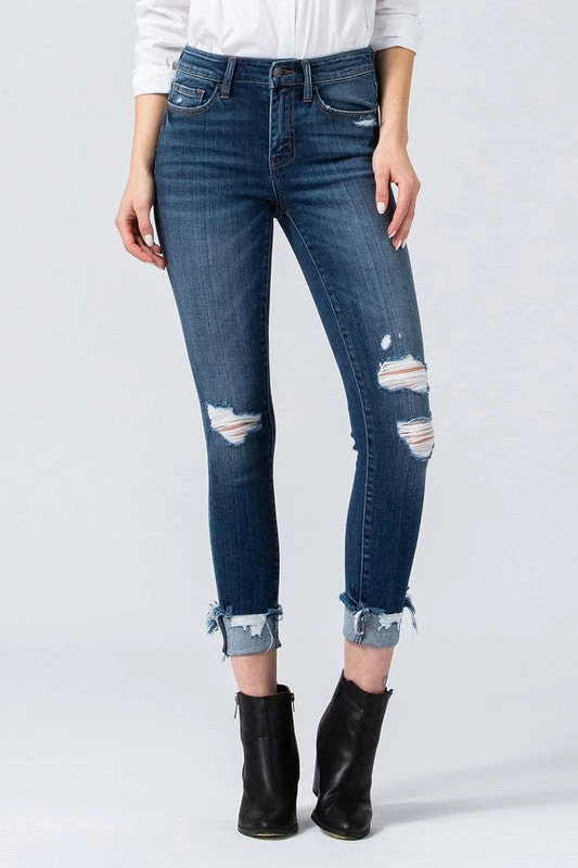 Are you looking for a great mid-dark denim jean with a little distress? Check out our Denny mid-rise distressed jeans with a slanted cuff detail