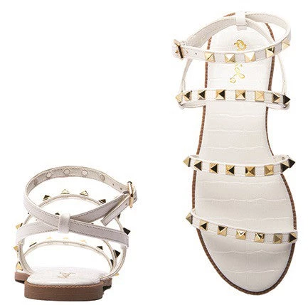 Are you looking for a great flat sandal with some style and that will look great with your summer outfits? Check out our Vicki white and gold studded flat sandals