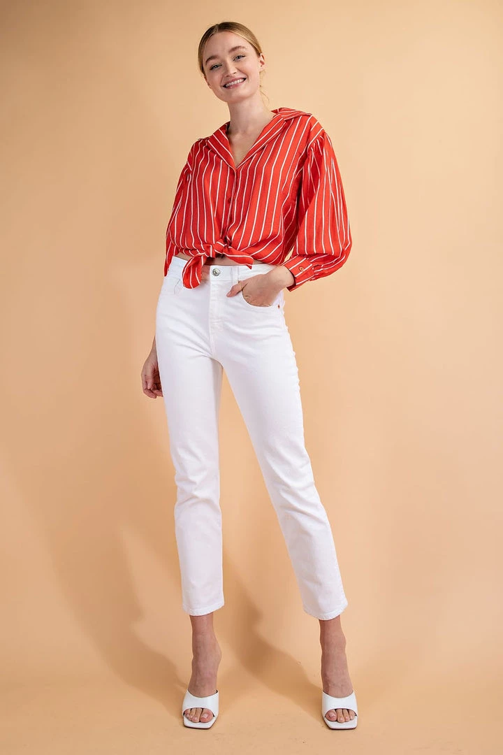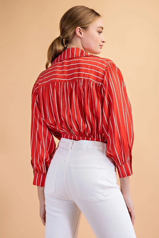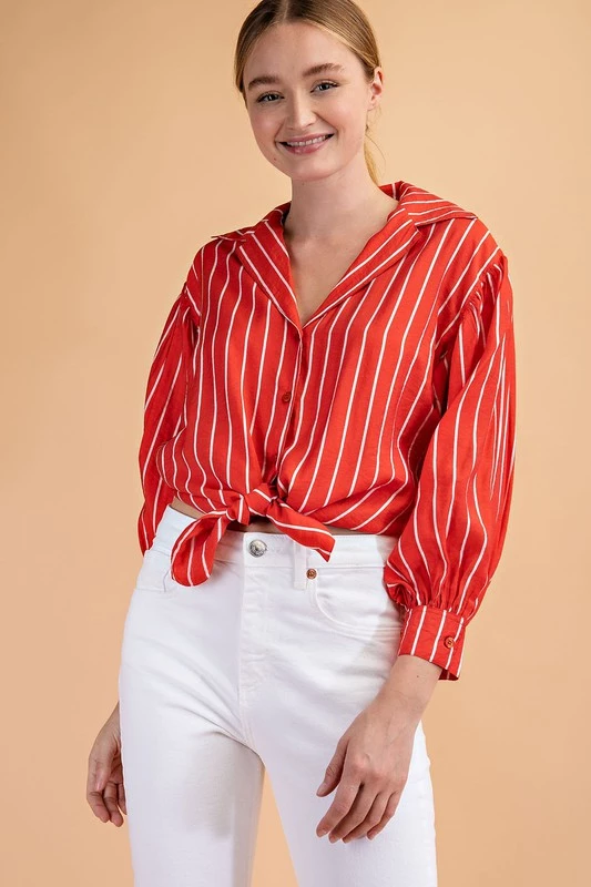 Are you looking for the perfect fun button up top with some color? Pair our coral striped top with your favorite shorts or denim for the spring