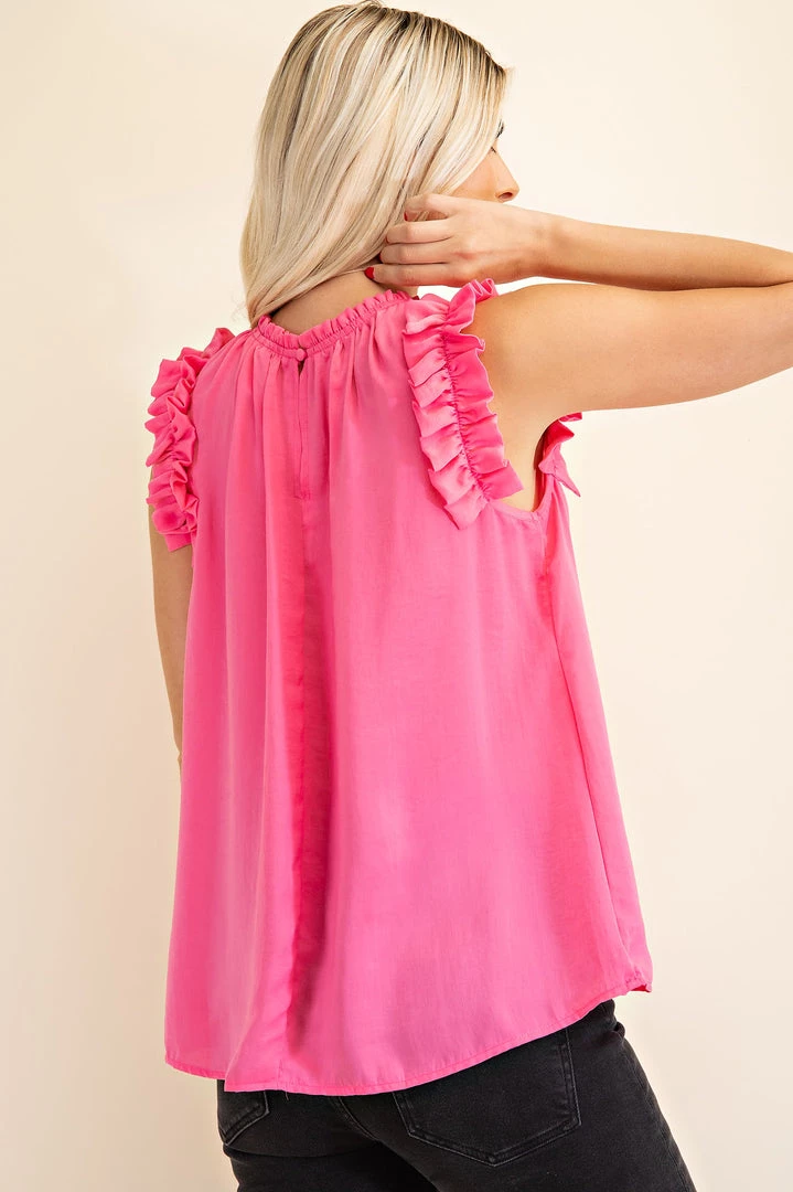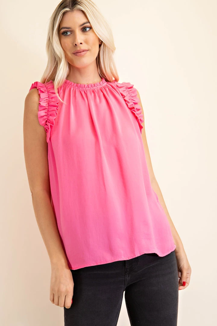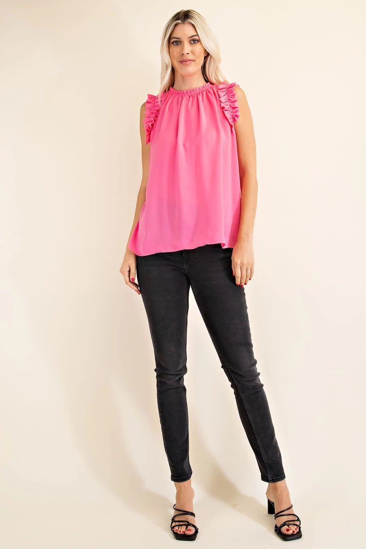 Are you looking for the perfect sleeveless summer top with some color? You will love our hot pink high neck ruffle sleeve top dressed up with your favorite pants or dressed down with your favorite denim shorts
