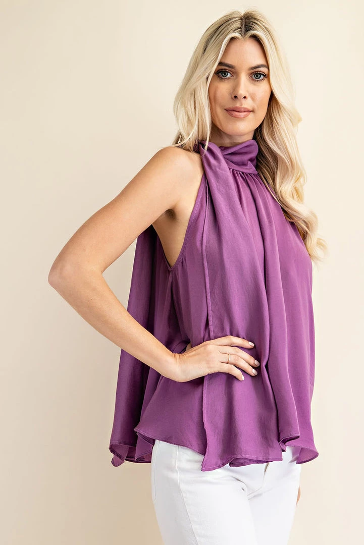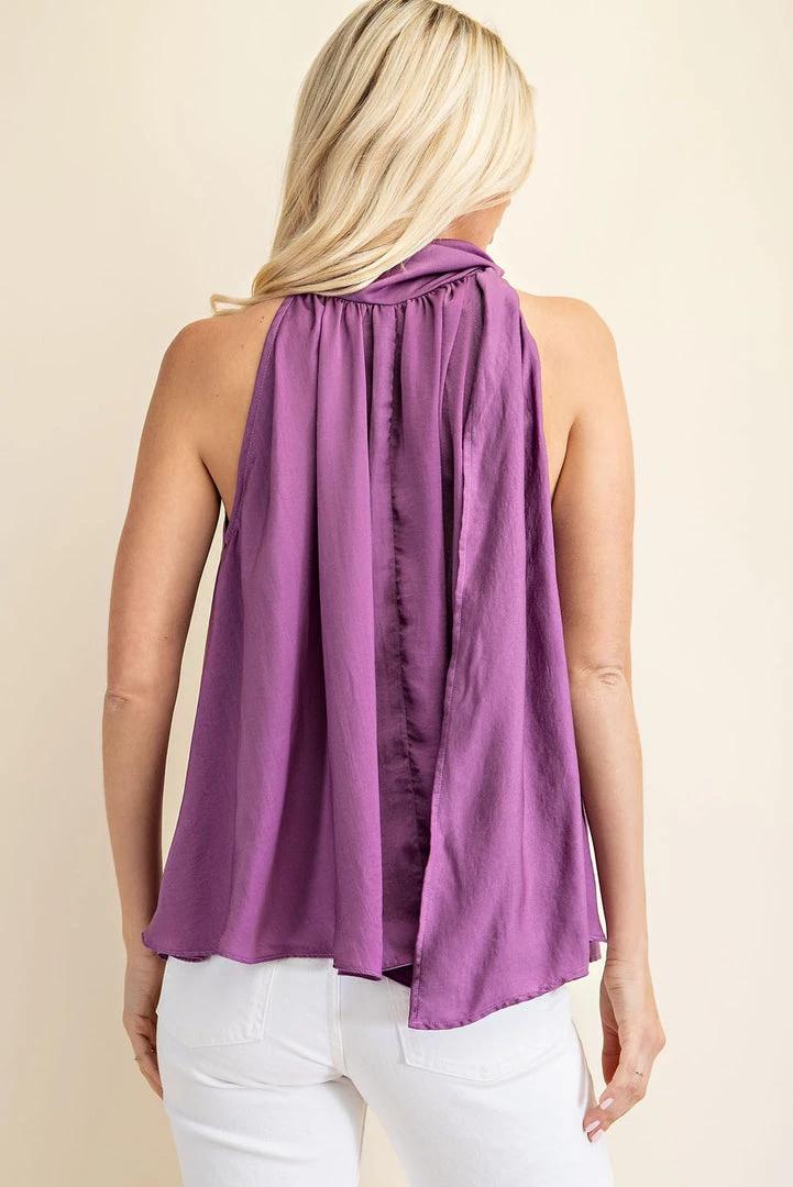 Are you looking for the perfect top with the perfect color that will dress up your favorite bottom for your event or party? We are in love with our purple-colored tie-front sleeveless blouse