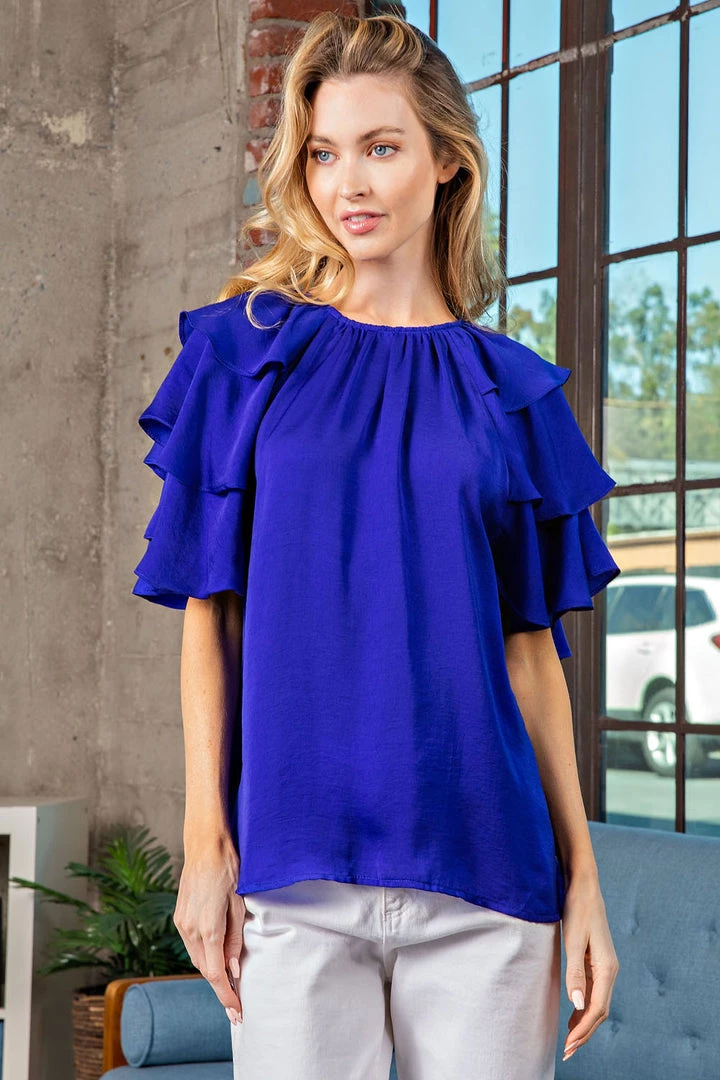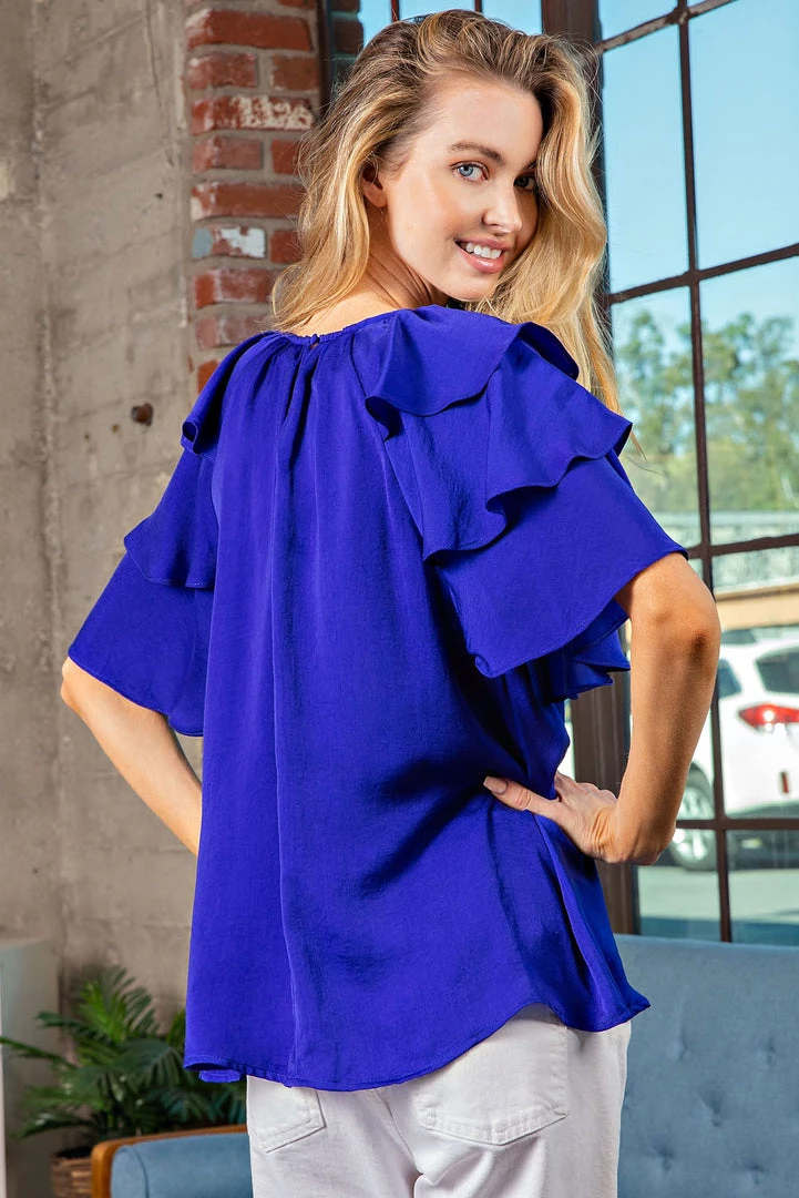 Are you looking for the perfect top with some color that will look amazing with white denim or your favorite summer dress shorts? You will love our royal blue ruffled sleeve top