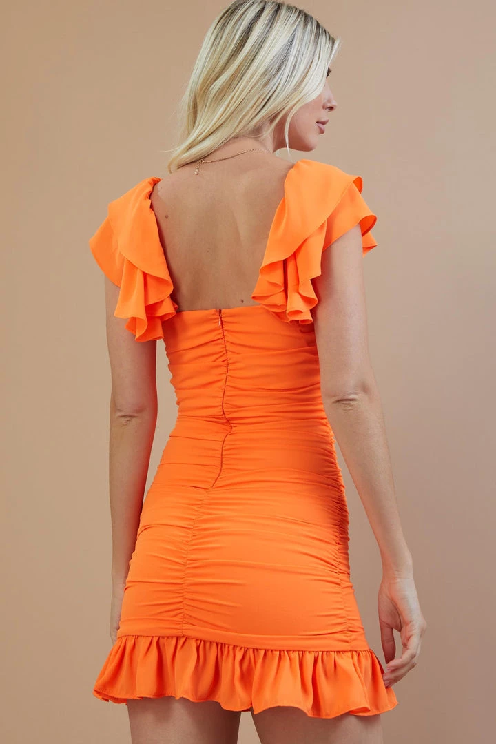 Are you looking for a seriously cute fitted dress to own the night at your upcoming event? You will look and feel great in our orange colored ruched mini dress with a ruffle detail
