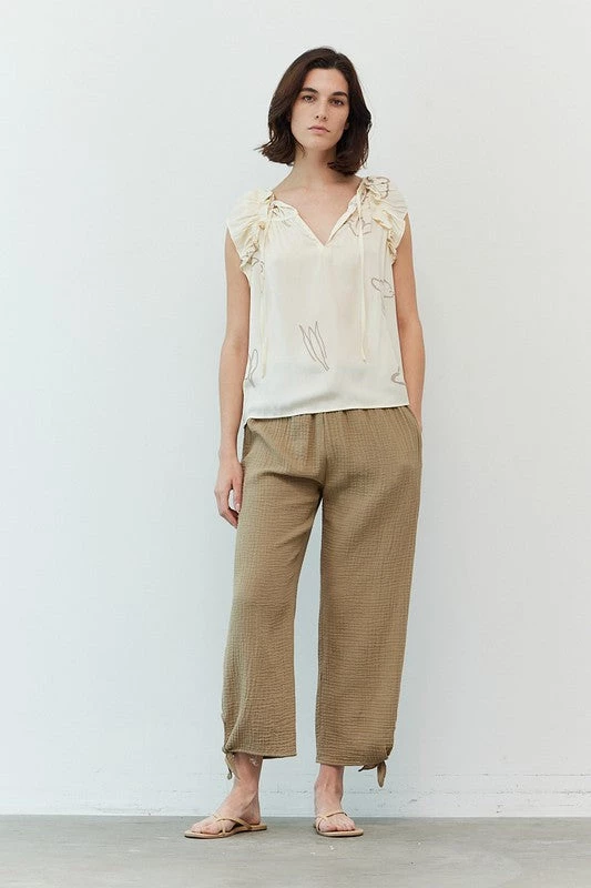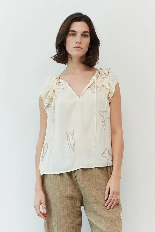 Are you looking for the perfect lightweight top with some cute style to it? You will want our cream colored satin floral ruffle blouse paired with your favorite pants or shorts