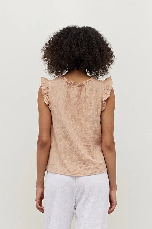 Are you searching for the perfect summer blouse that will look great with your favorite denim or linen pants? You will want our soft rose double gauze ruffled blouse