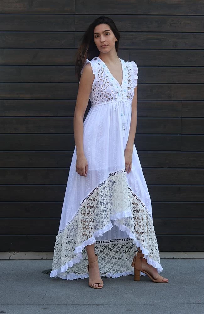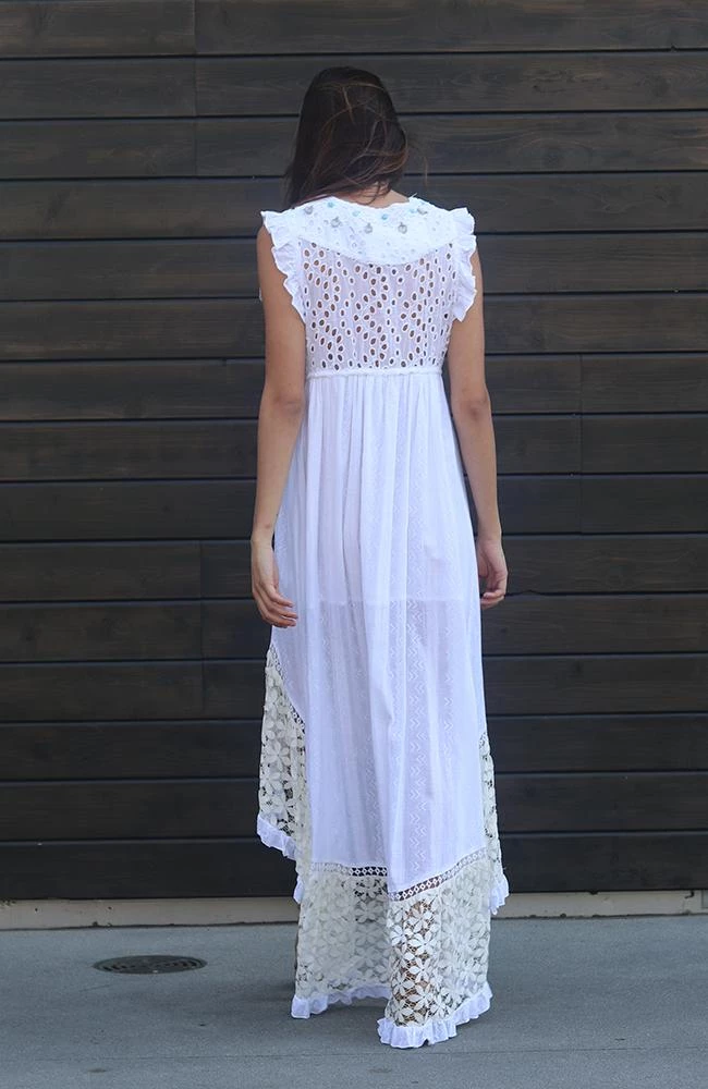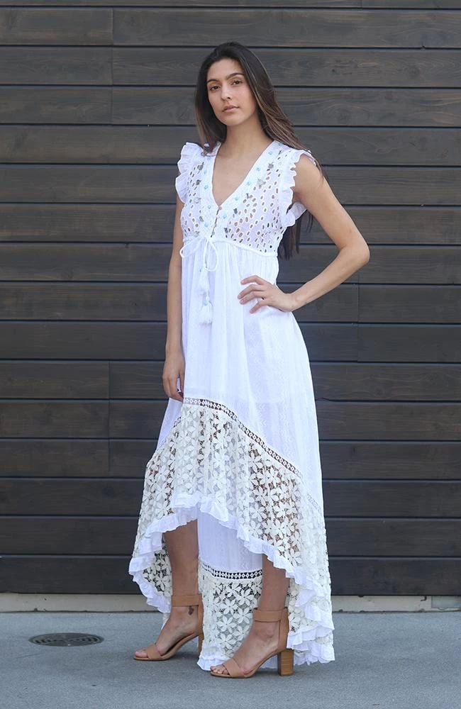 Are you needing an elegant white dress for your next event? Check out our jeweled and lace high low dress with coin detail