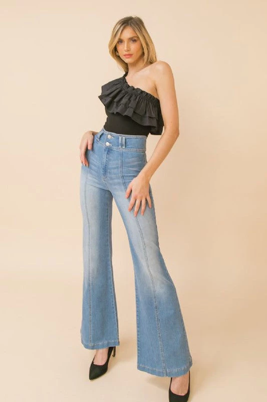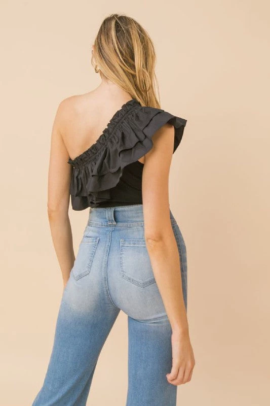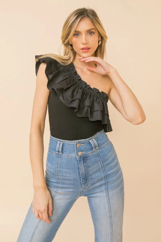Are you looking for the perfect bodysuit with some flare to it? Check out our super cute black one shoulder bodysuit that looks amazing with your favorite denim