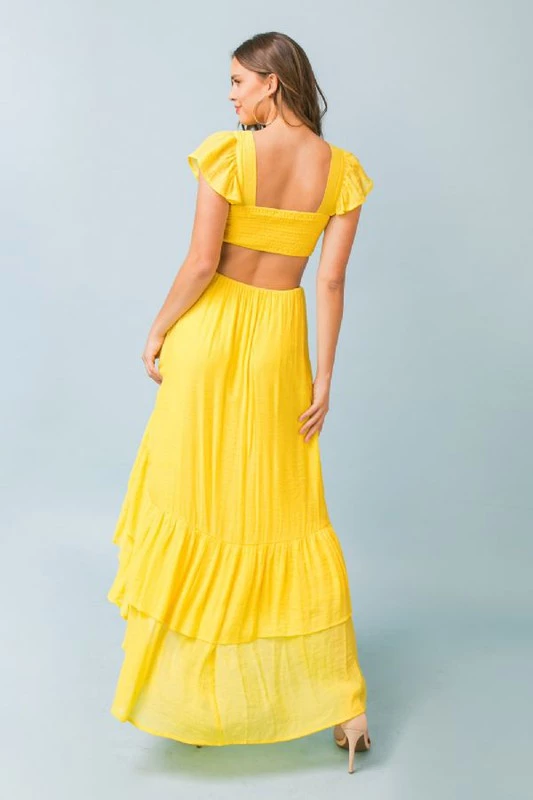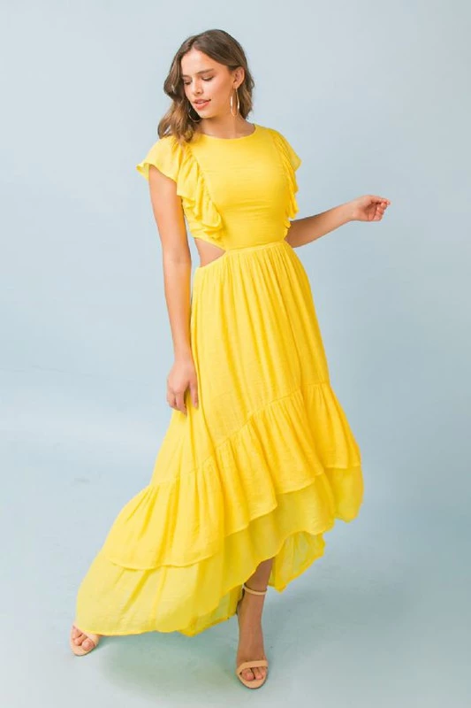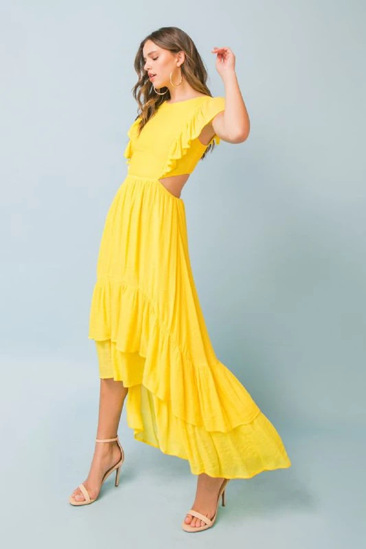 Are you looking for a fun and flirty dress for your evening summer event? You will look and feel amazing in our yellow side cut out summer hi-low dress