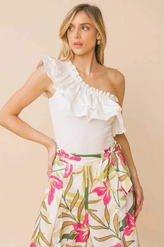 Are you looking for the perfect bodysuit with some flare to it? Check out our super cute white one shoulder bodysuit that looks amazing with your favorite denim