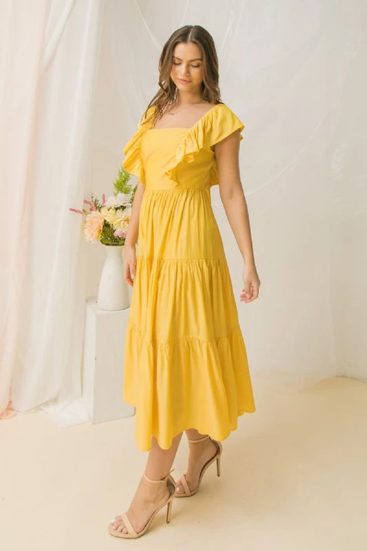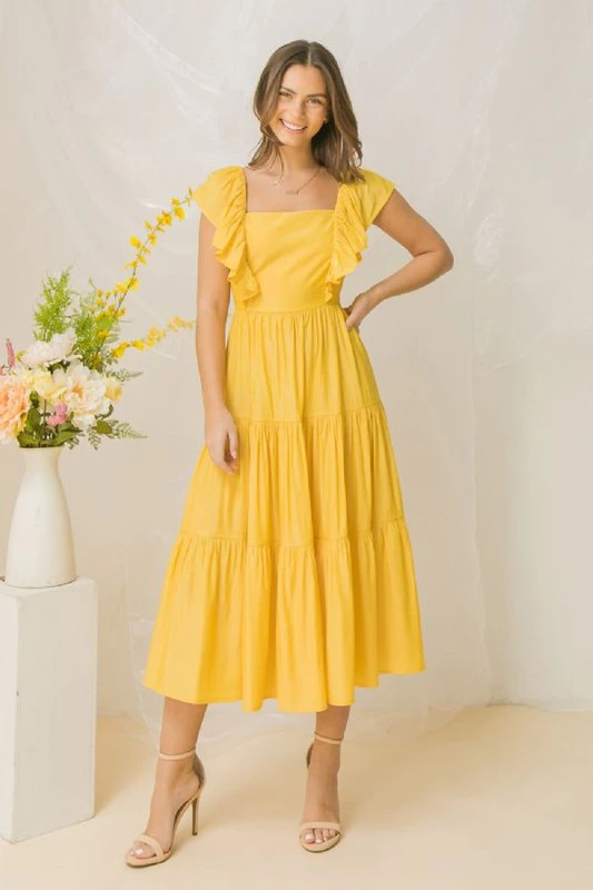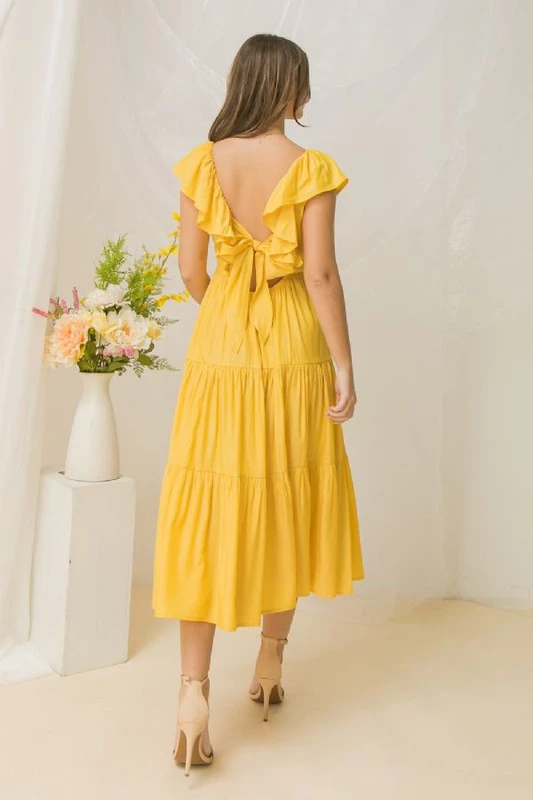 Are you looking for a beautiful dress with the perfect amount of spring and summer vibes? You will love our yellow ruffled shoulder midi dress that features an open back and with a self tie and elastic opening
