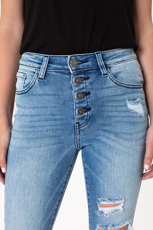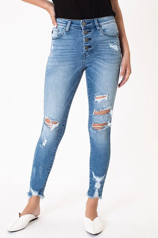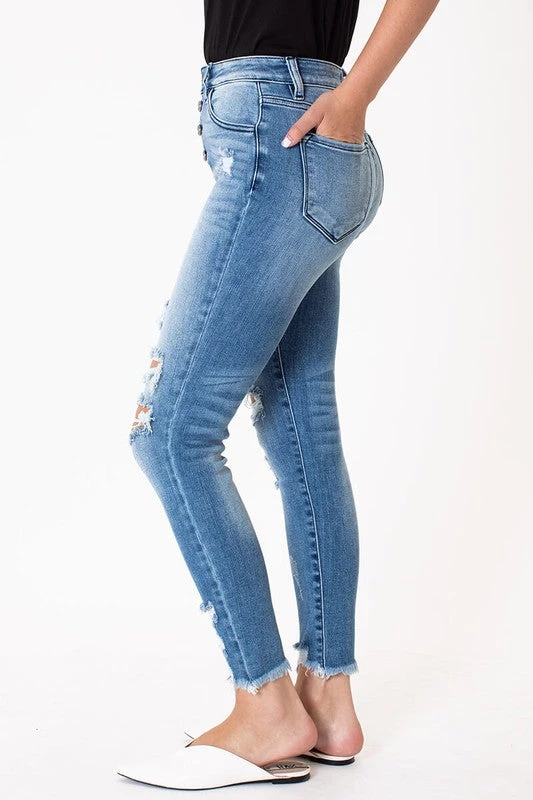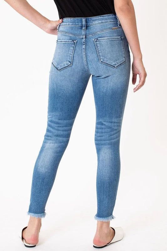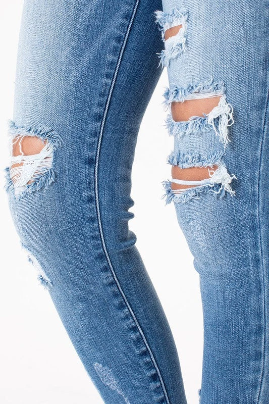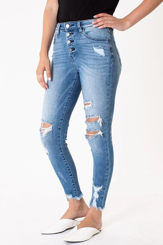 Are you looking for the perfect pair of high rise denim with distress? Check out our Chantal high rise skinny jeans