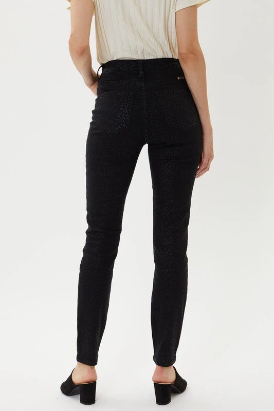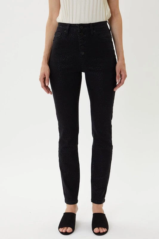 We know you have a black pair of jeans but do you have a pair of black leopard print jeans? Check out our Briana black leopard print exposed button high rise denim