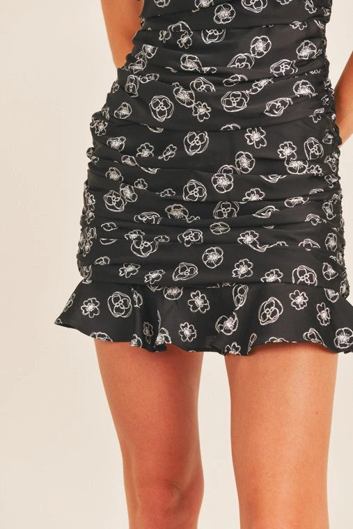 Are you looking for a hot little mini dress that will look amazing with your favorite neutral-colored heels? Check out our black and white ruched floral print mini dress