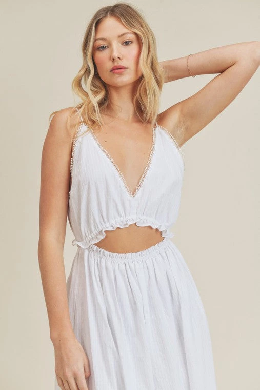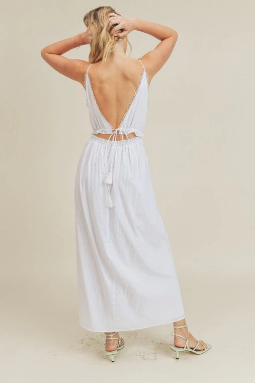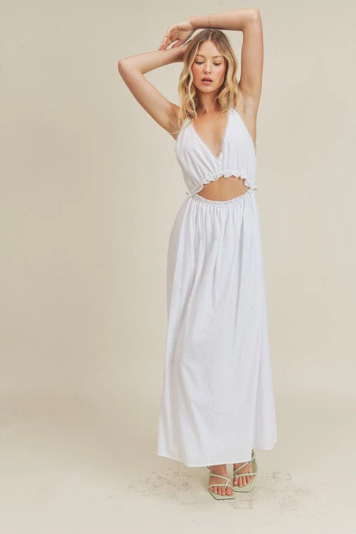 Are you looking for the perfect dress that gives off those beach vibes? You will surely feel those vibes in our white waist tie maxi dress.
