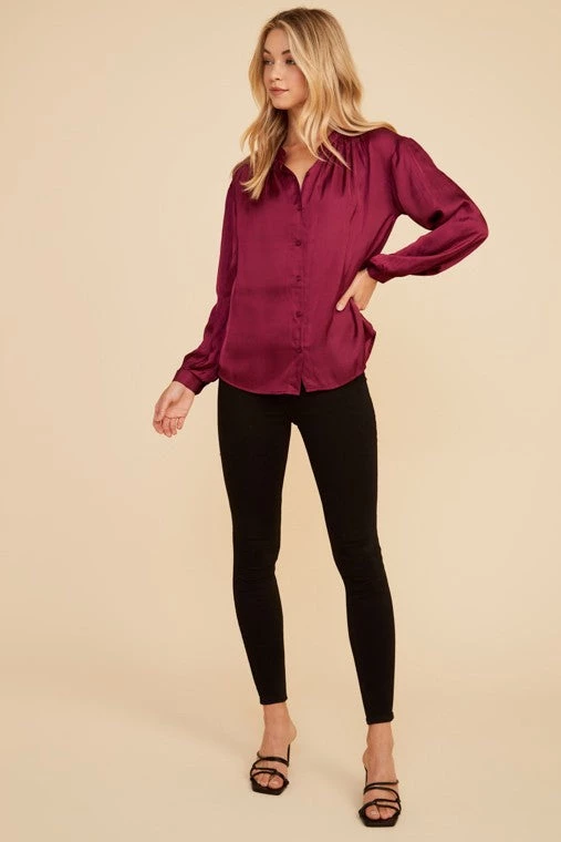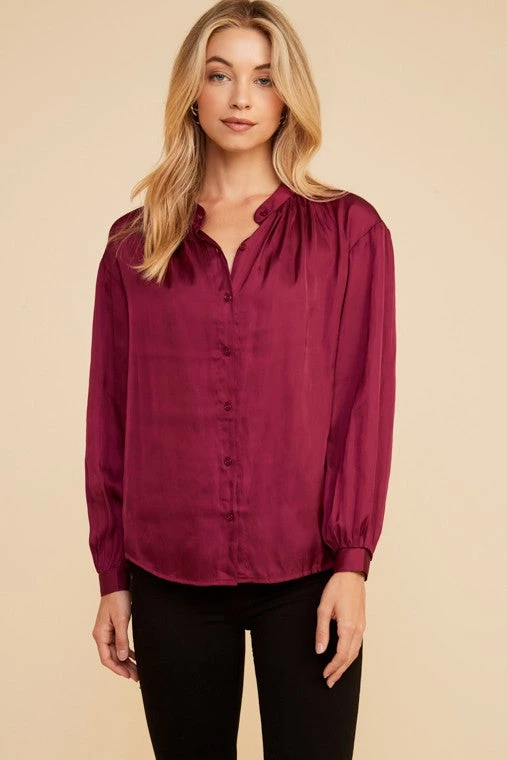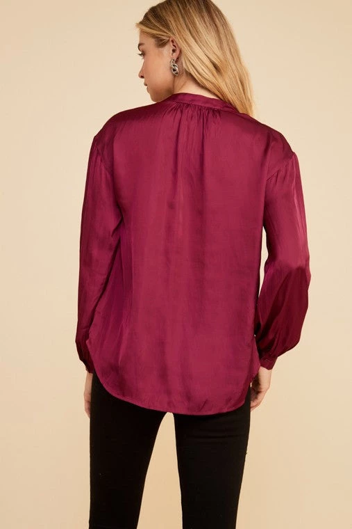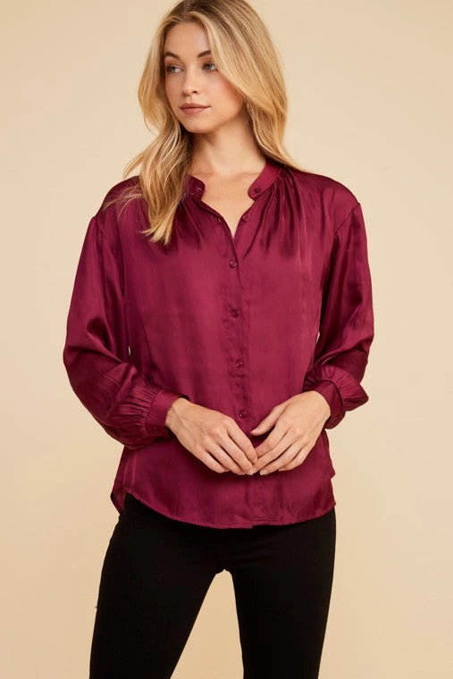 Are you looking for a cute button-down top that will transition well into the holidays? You will want our red satin flowy cuffed sleeve button down top