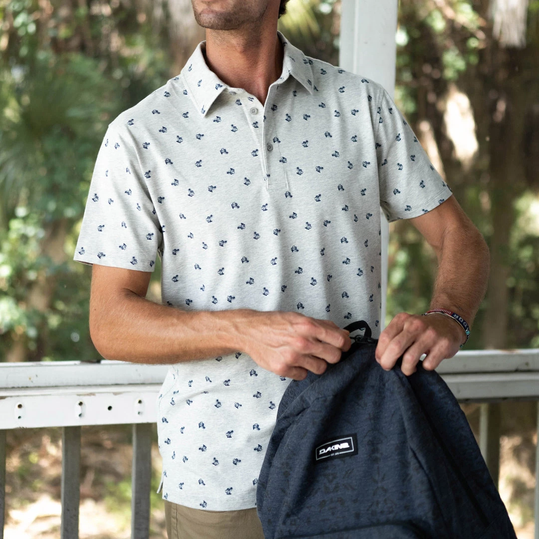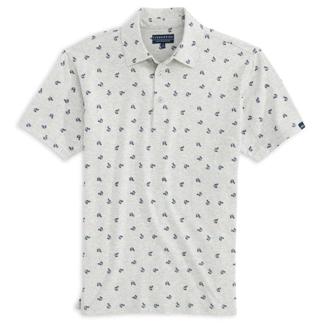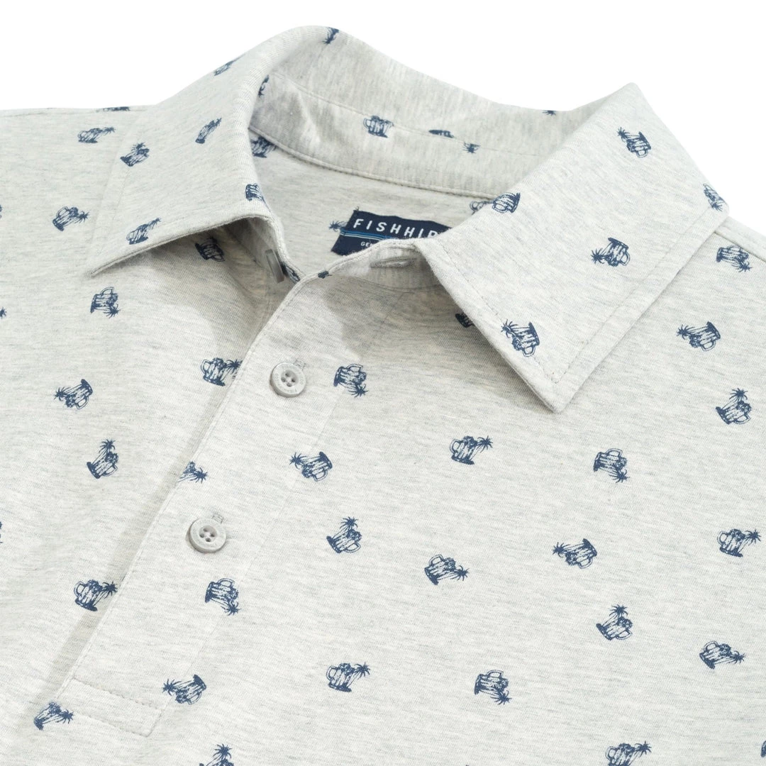 Are you looking for the perfect evening attire for your next casual event or the perfect polo for vacation? Check out our Fish Hippie smuggler heather great polo that features mini palm trees and beer mugs