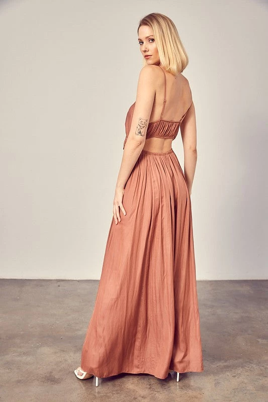 Are you searching for a super unique and elegant dress that will have heads turning when you enter the room? You will fall in love with our cinnamon colored drawstring front slit maxi dress