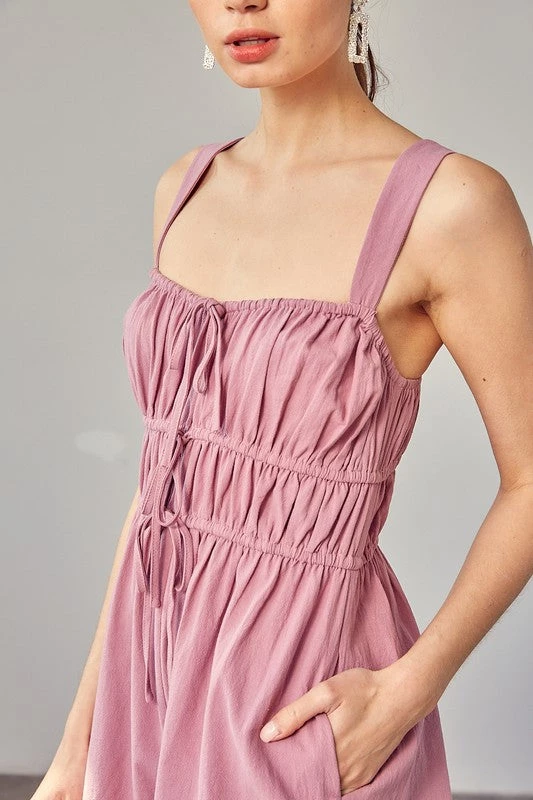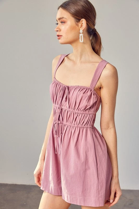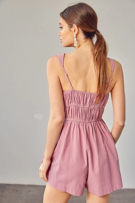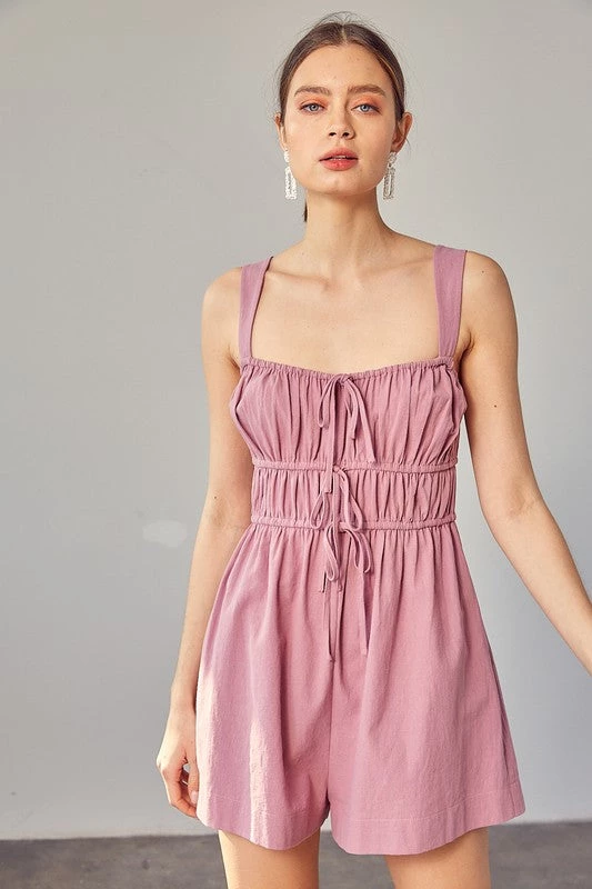 Are you looking for a romper that will dress up perfectly for your weekend event? We are in love with our new dark lavender drawstring ruched detail romper
