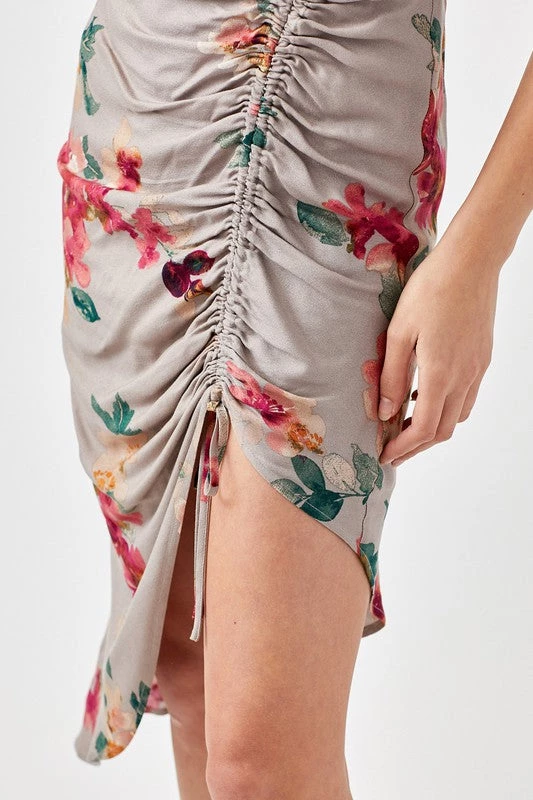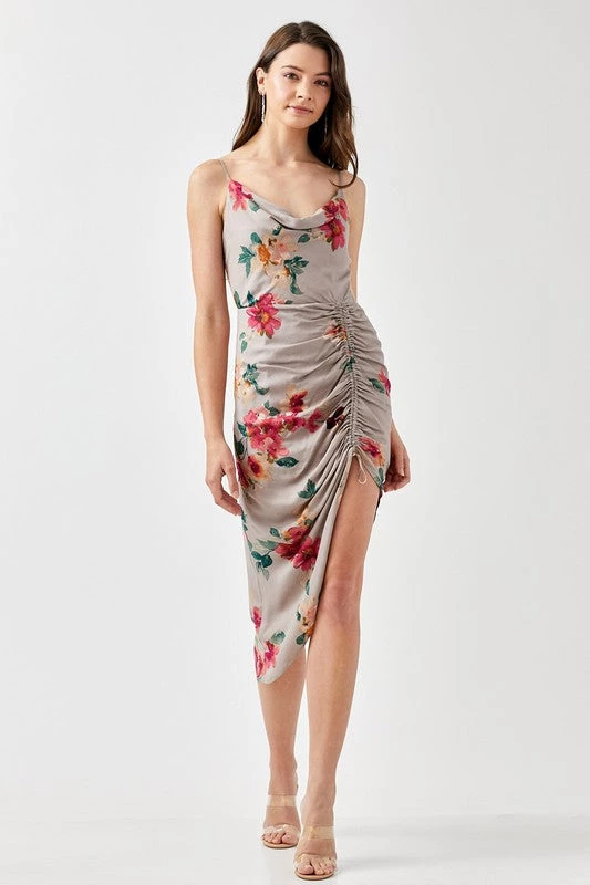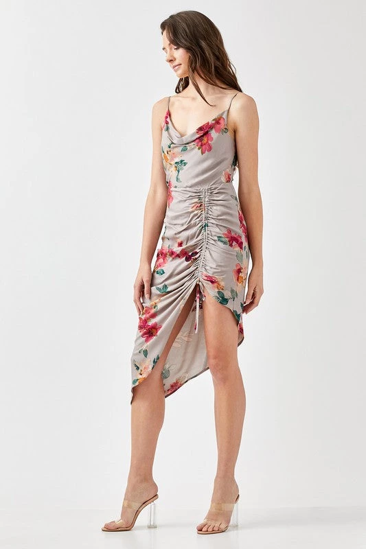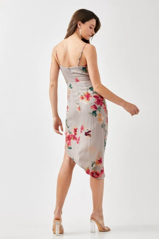 Are you looking for an amazing summer cocktail dress? You are going to love our grey and floral printed cowl neck cami dress with your favorite heels or wedges