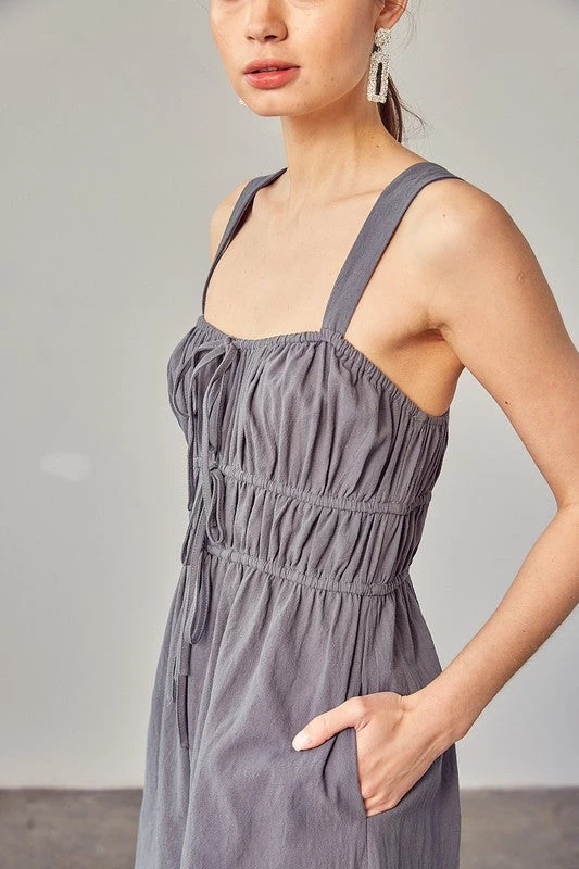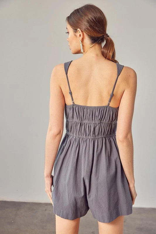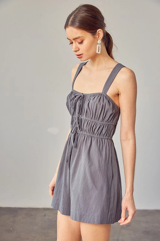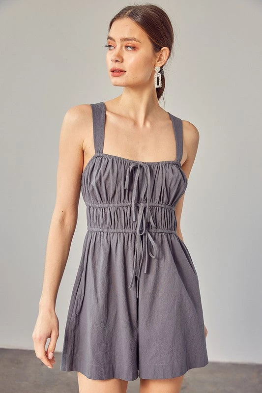 Are you looking for a romper that will dress up perfectly for your weekend event? We are in love with our new steel green drawstring ruched detail romper