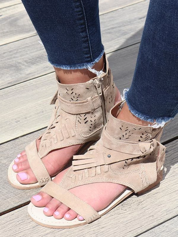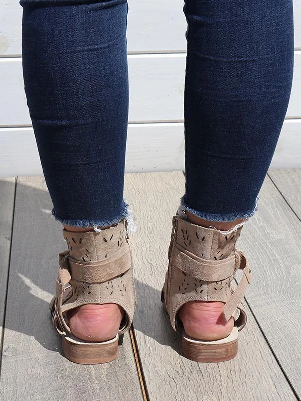 Plush tan suede sandal with intricate laser cut detail and a small heel, what a beauty.