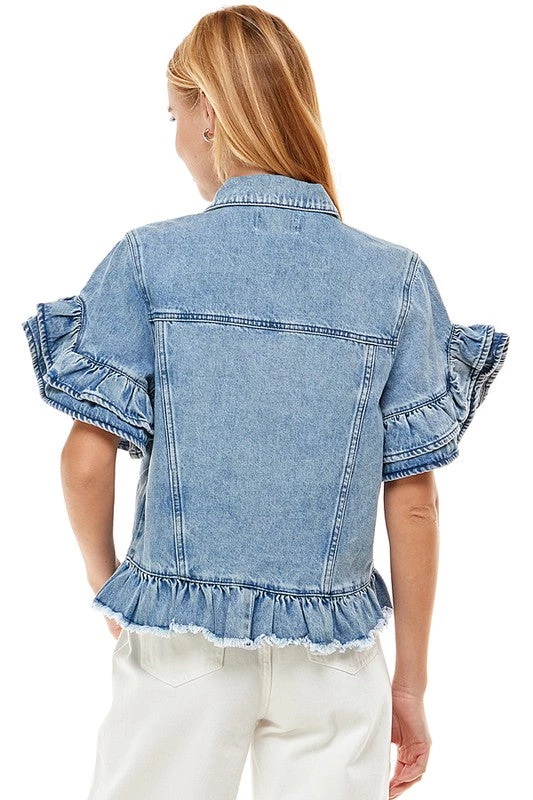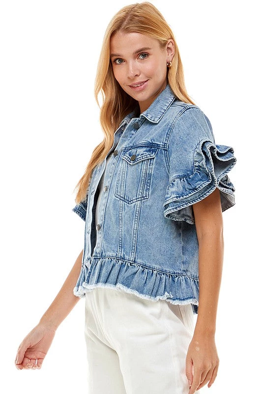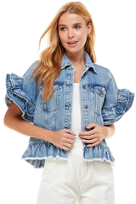 Are you looking for a super cute summer denim jacket? Pair our short sleeve ruffle denim jacket with your favorite outfits for an amazing look