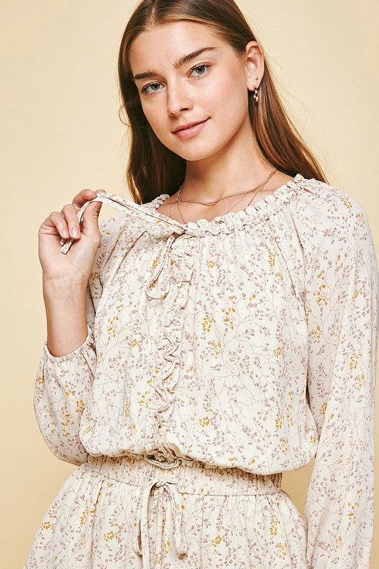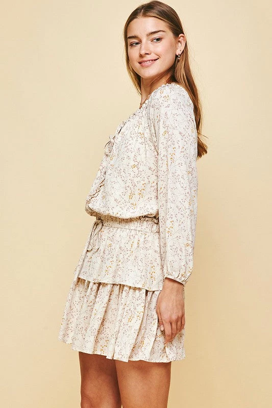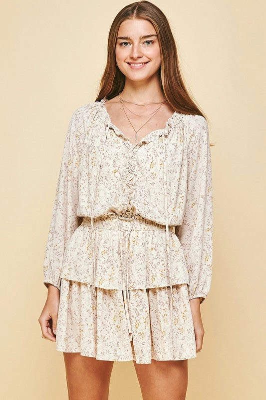 Are you searching for the perfect flirty mini dress? We have it! You will love our nude and floral ruffle mini dress that features an elastic waistband and front tie closure
