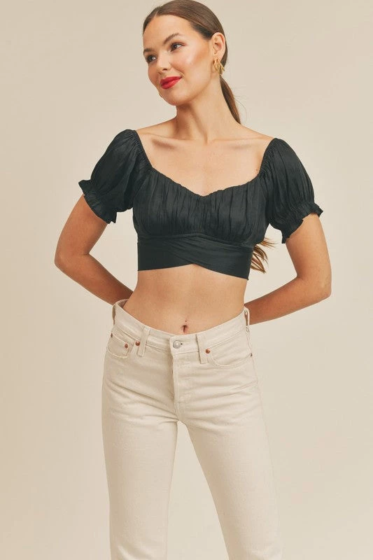 Are you looking for a super cute black cropped top with some style to it? You will fall in love with our super cute black cropped back tie detail top