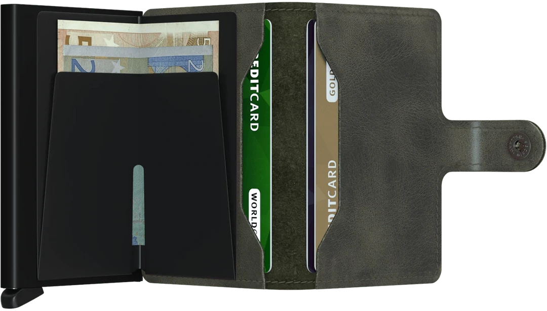 Miniwallet Vintage Olive-Black is corrected-grain leather, made in Holland from European cowhide. For more information on leather characteristics, our production process or care instructions, visit our leather page.