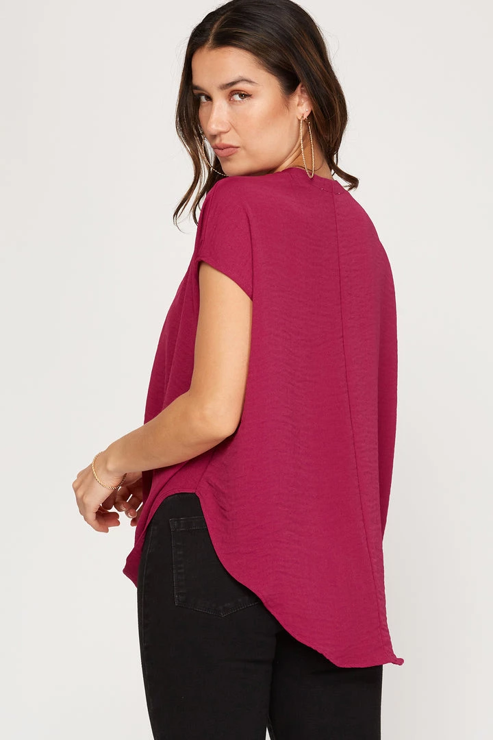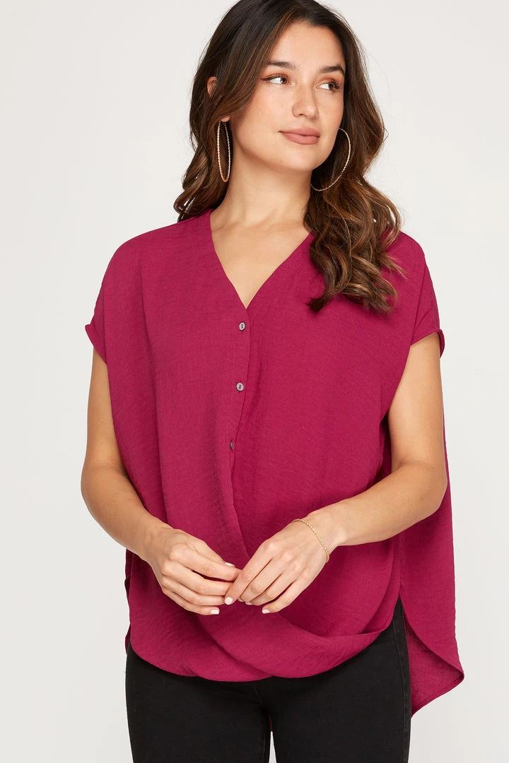 Are you looking for a cute lightweight top with some color? You will love our magenta colored drop shoulder front twist top paired with your favorite pants or denim