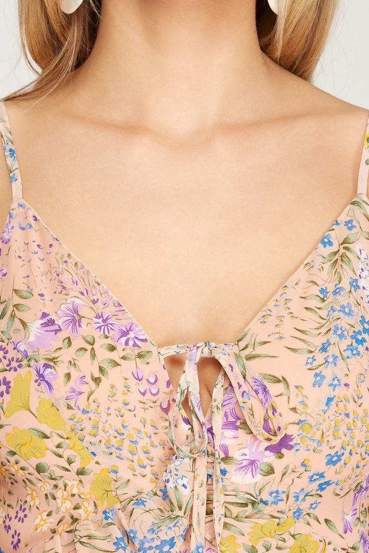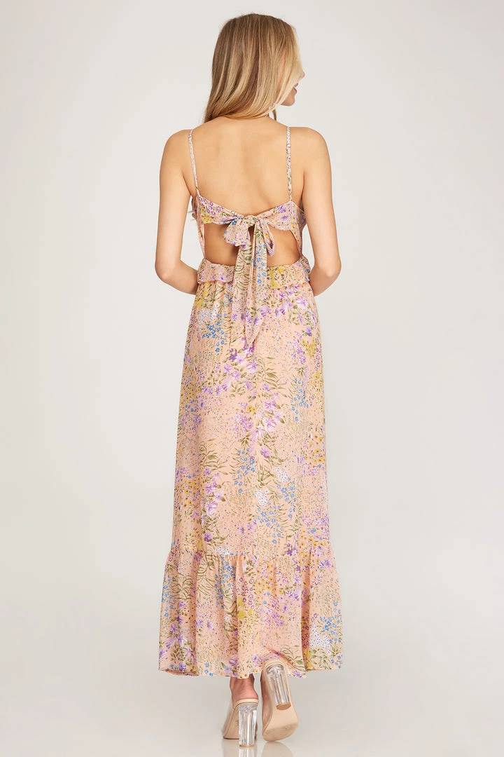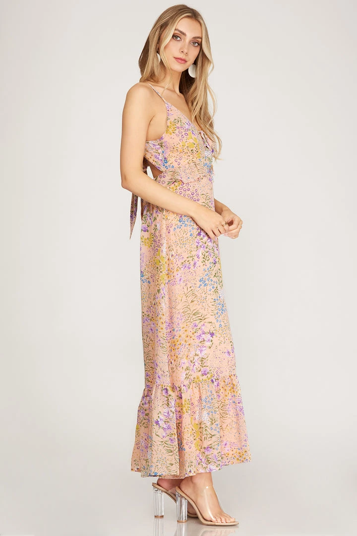 Are you looking for a stunning summer maxi dress that will have you looking and feeling fabulous? You will fall in love with our peach and floral sleeveless maxi dress that features a back tie detail