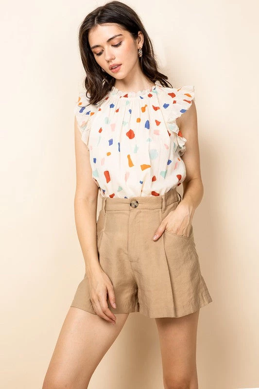 Are you looking for a white top with the perfect amount of color and print? You will love our cream and multi-color design flutter sleeve top