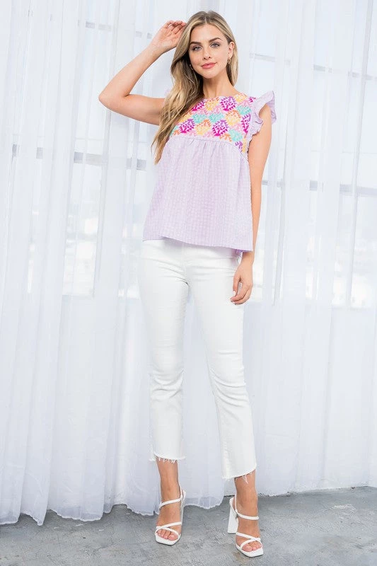 Are you looking for an absolutely amazing top that looks great with white pants or white denim? You will love our lilac-colored multi-design embroidered top