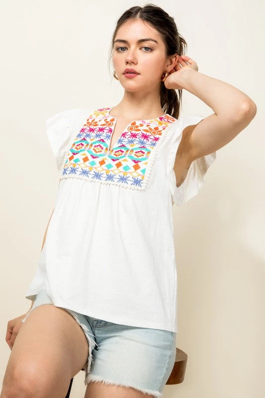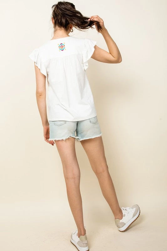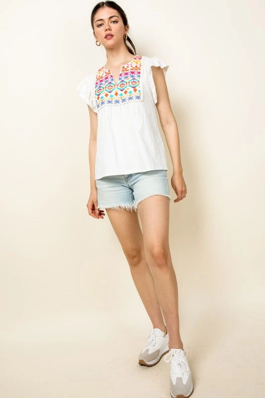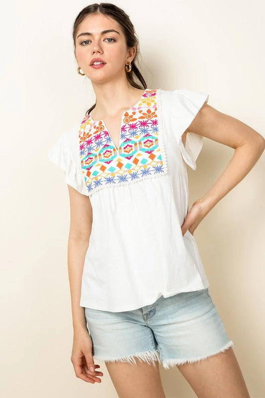 Are you looking for a cute summer top that looks great with denim? You will love our white and embroidered flutter sleeve top
