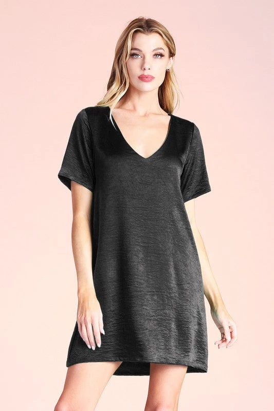 Are you looking for a casual yet stylish dress that will look great dressed down with your favorite white sneakers or dressed up with your favorite wedges? You will love our black washed satin crepe short sleeve dress