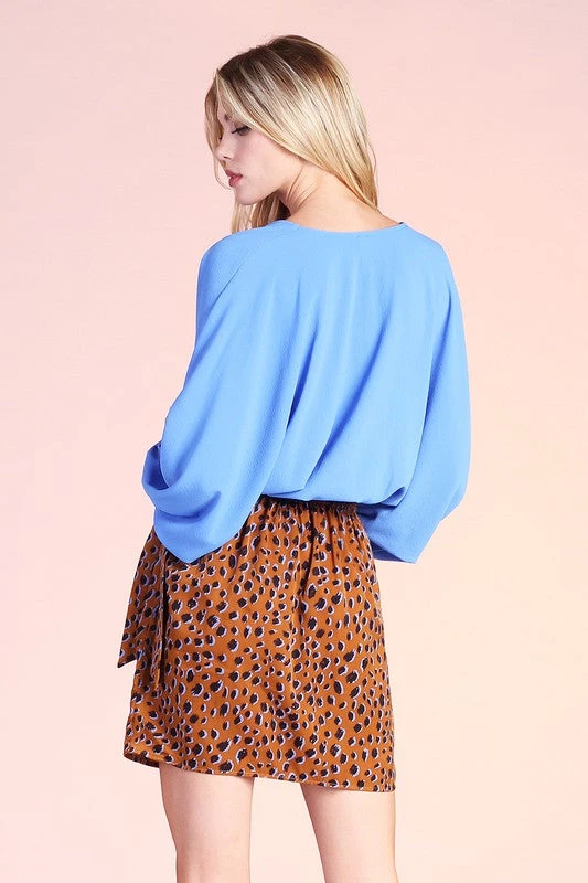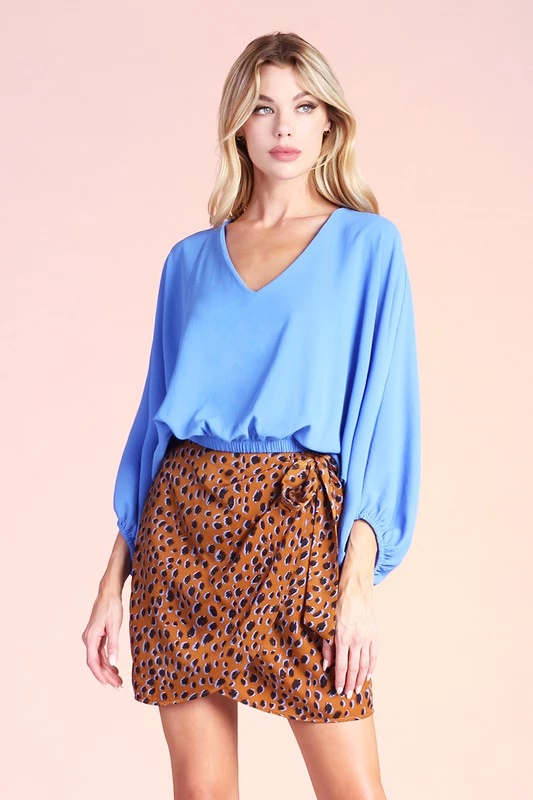 Are you looking for an elegant and flowy top that will pair very well with your favorite skirt or white pants? You will love our clean blue textured solid v-neck dolman top